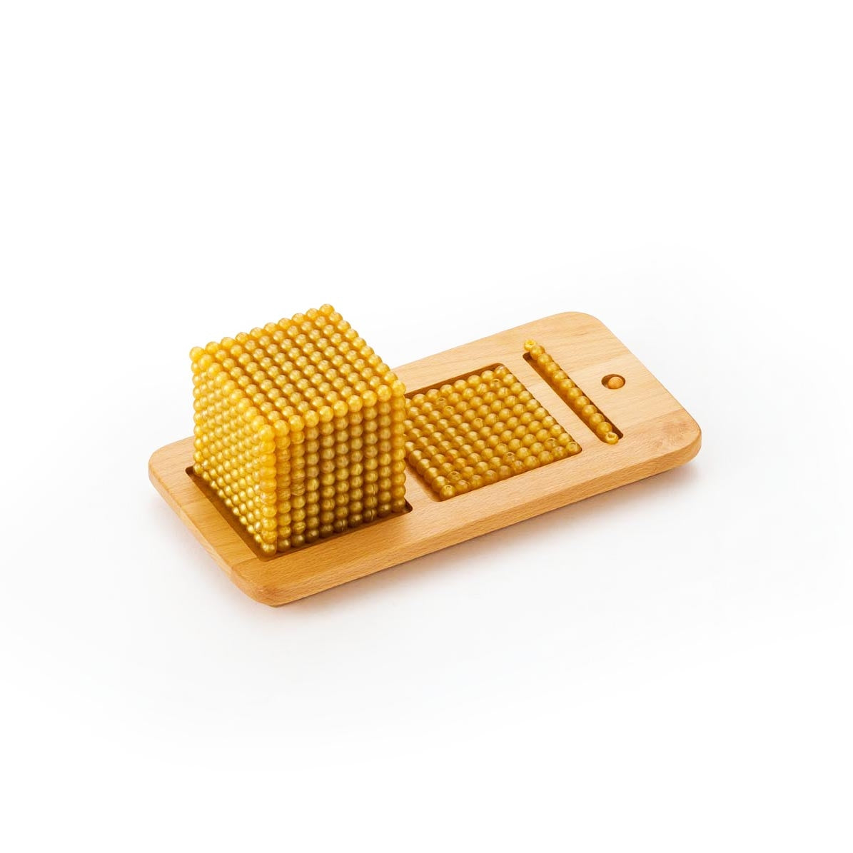 Each of the units, tens, hundreds and thousands are presented to the child in a Three Period Lesson. The cards for the Introduction of Decimal Symbols are used alongside this material.