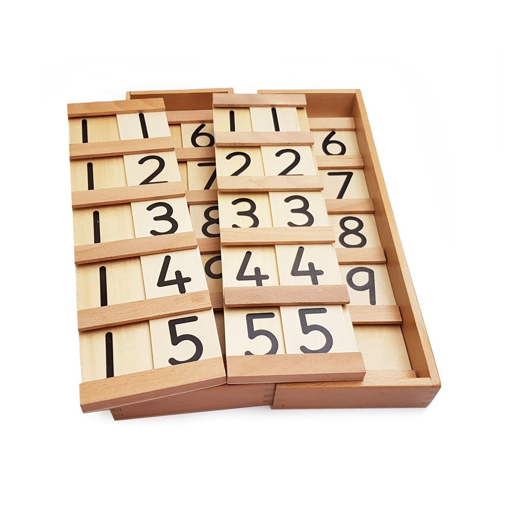 The two wooden boards have 9 number slots each labelled with 10 and the child counts up sliding the wooden digit cards 1 to 9 into these slots.