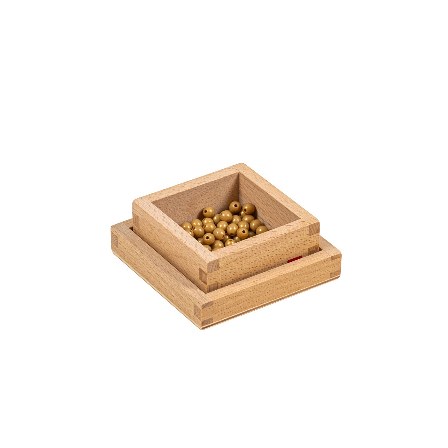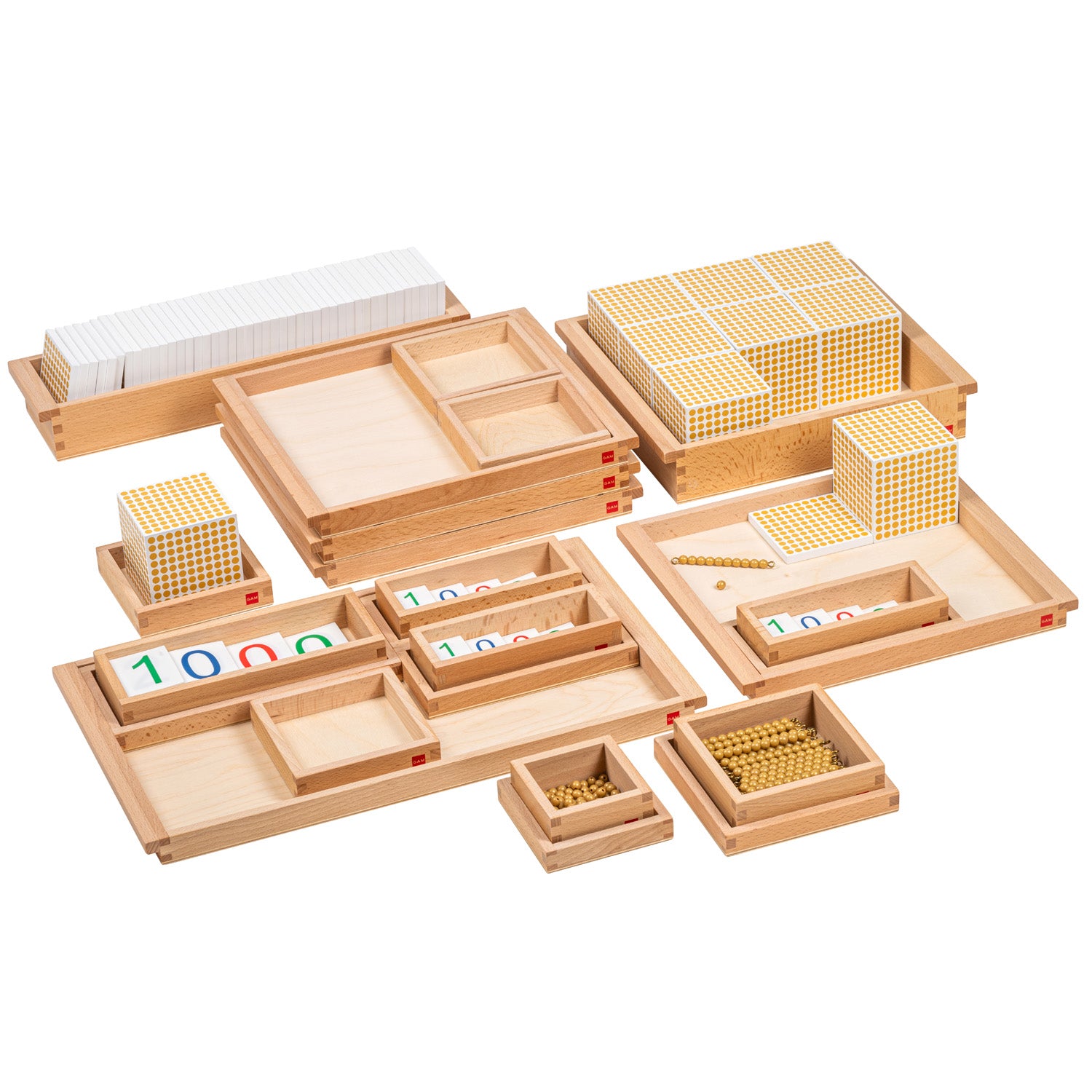 The Golden Bead Material introduces the child to the decimal system with concrete representations of the hierarchy of numbers. Quantity and place value is explored by the child through activities in the operations of addition, subtraction, multiplication, and division.