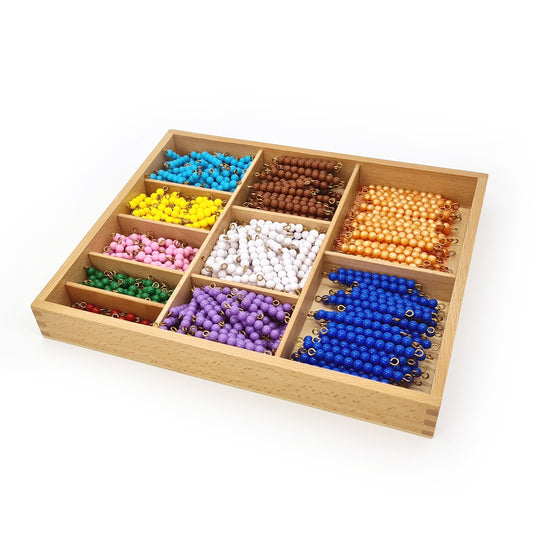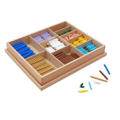 The purpose of this material is to introduce the child to the multiplication tables 1x1 through 10x10. The box contains 100 sets of bead bars 1-10 to layout each table and its corresponding product.