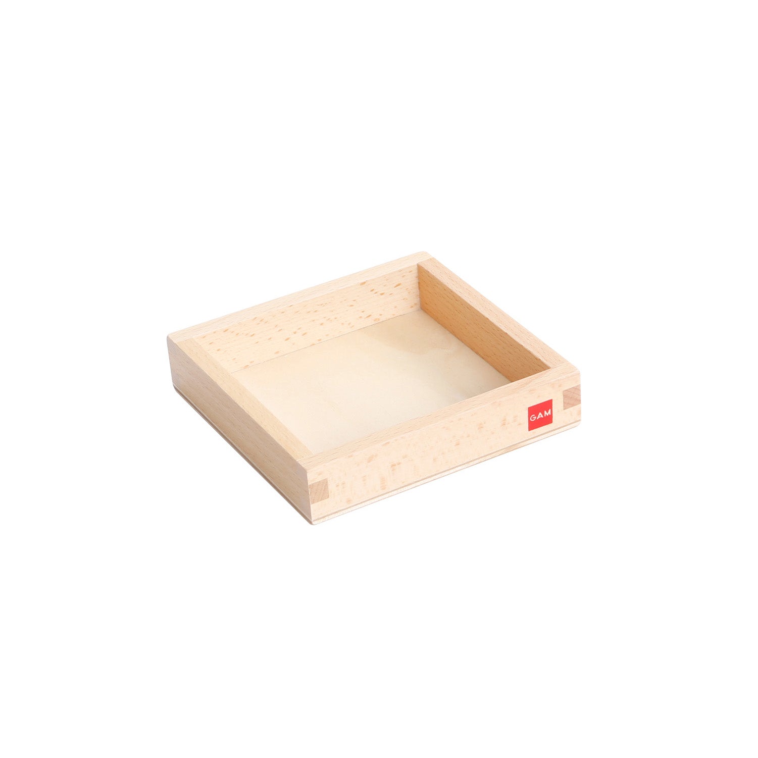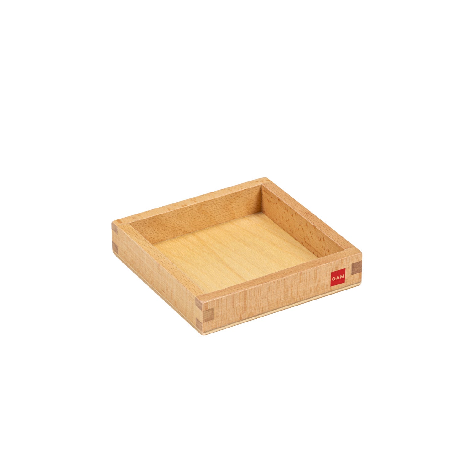 Wooden tray for a variety of practical life exercises, i.e.: polishing exercises, folding, and pouring. The tray is also suitable for use in all areas of the prepared environment for example for beads in the maths area.