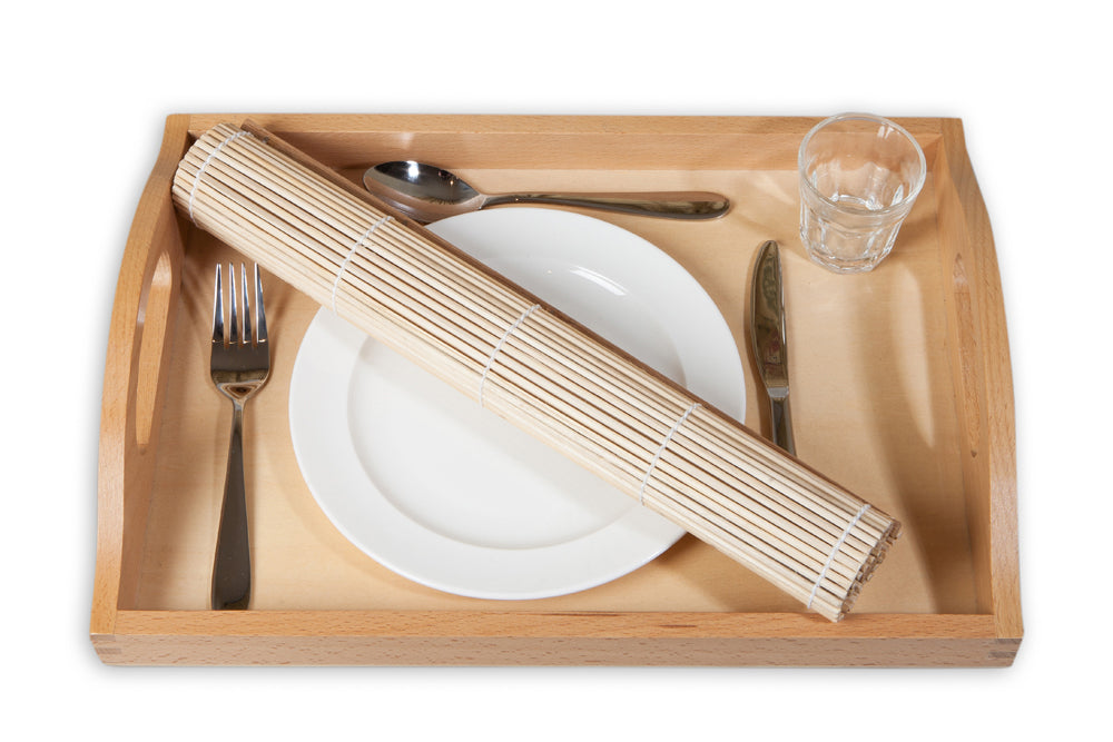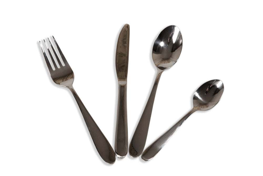 A four piece stainless steel cutlery set comprising a childsized knife, fork, spoon and teaspoon. The knife blade has a serrated edge to enable the child to cut food.