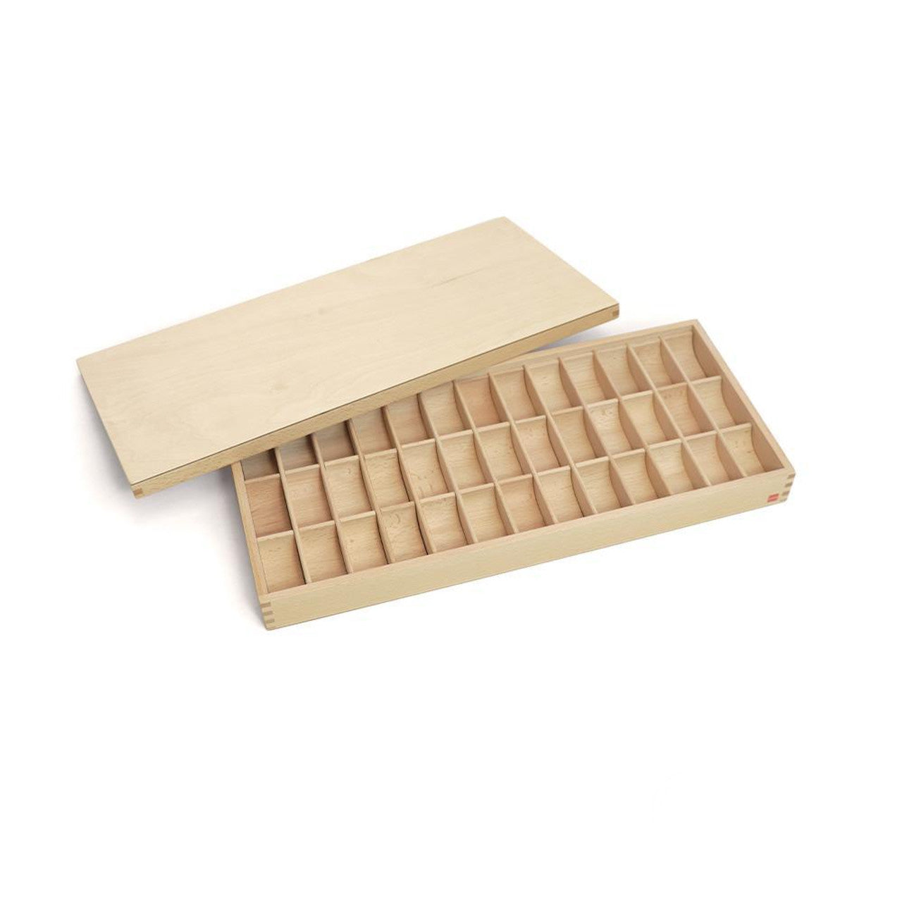 Wooden box and lid with slanted compartments for storing letters. Letters are ordered separately (see related items below).