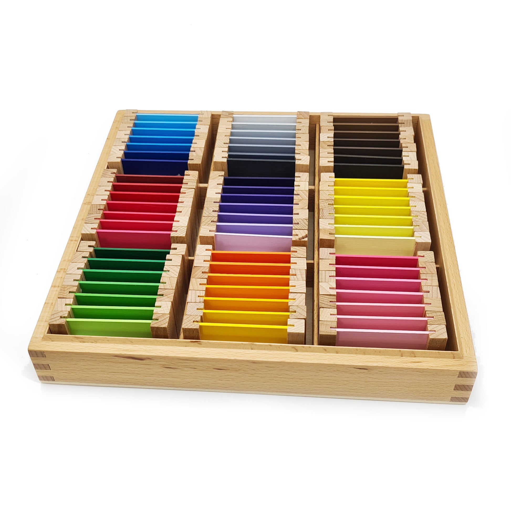9 sets of 7 graded tablets in shades of red, orange, yellow, green, blue, purple, pink, brown, grey in a wooden box.