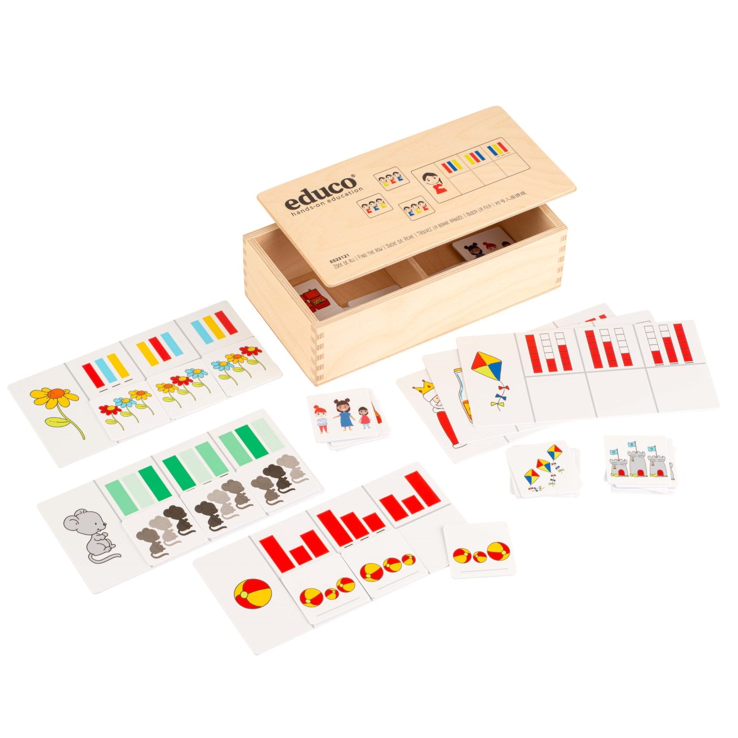 Find the row helps children learn to organize and classify categories for images. Children describe and compare an assignment strip and the three small cards that belong with it as full-empty, wide-narrow, and high-low, etc. This game inspires the use of descriptive words which to helps increase childrens's vocabulary. Self-checking.