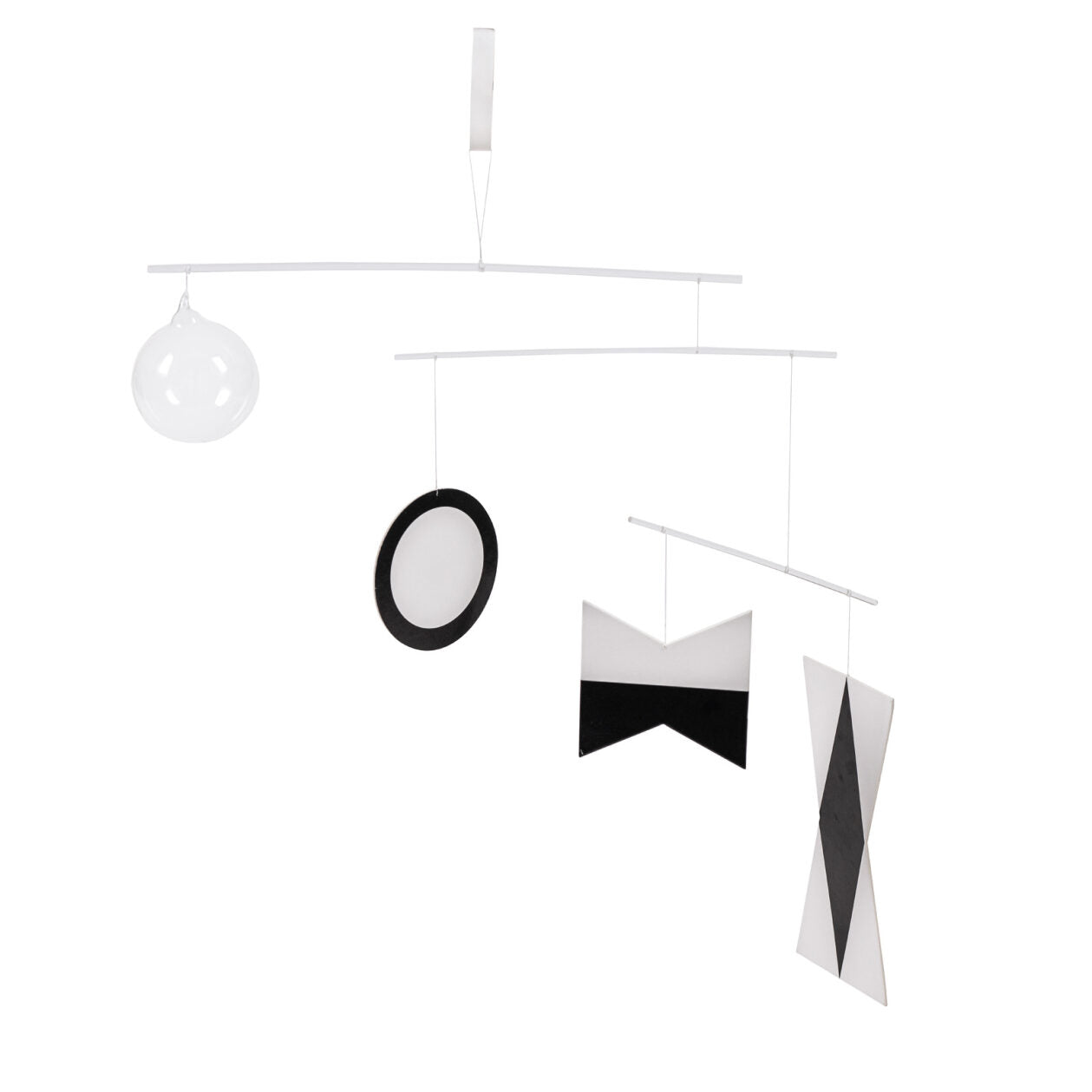 Made to the original specifications. The Munari Mobile was designed by Bruno Munari, an Italian artist, designer and inventor. It is comprised of black and white two-dimensional shapes and a transparent sphere that reflects the light.