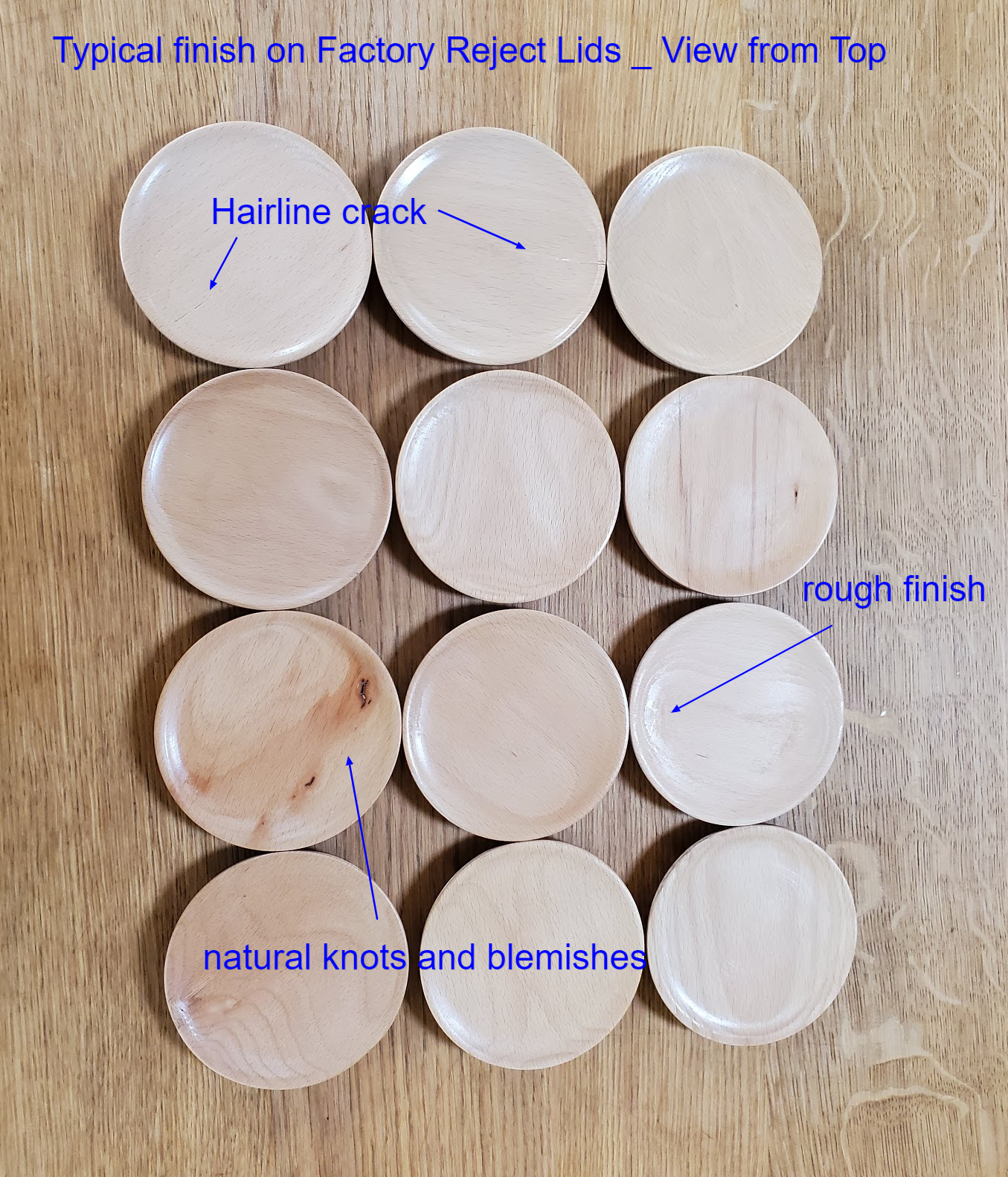 12 x LARGE beech wood lids (100mm or 4"). These are factory rejects and so there might be blemishes, a rough finish underneath, and typically some of these may not hold down but additional seals have been provided - hopefully allow 3-4 to fit firmly with the others used loosely without seals i.e. for storage items not requiring a firm seal. Others have used them as coasters. Essentially some may require re-oiling or sanding to make smooth. PLEASE SEE PICTURES