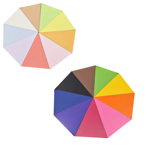 Two sets of 9 triangles in light red, orange, yellow, green, blue, purple, pink, brown, white to make a nonagon colour wheel.