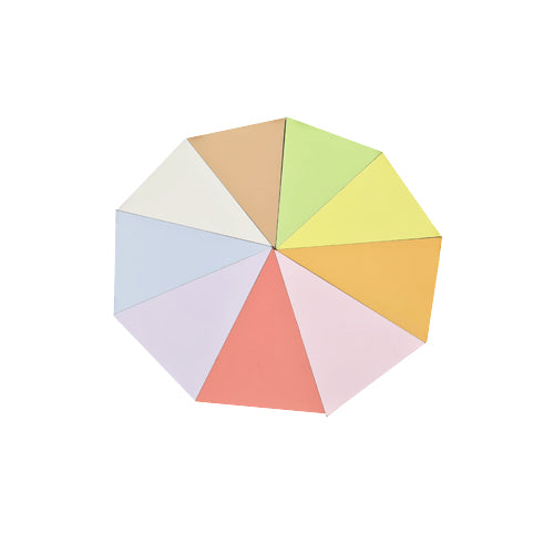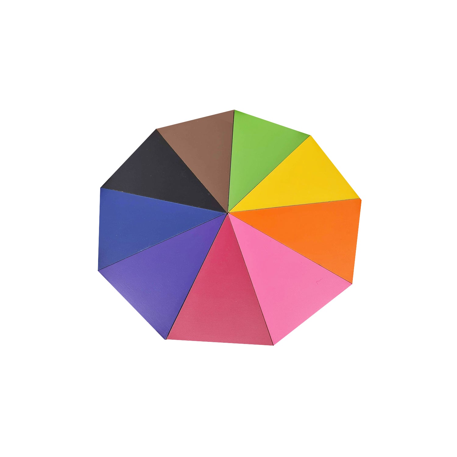 Two sets of 9 triangles in light red, orange, yellow, green, blue, purple, pink, brown, white to make a nonagon colour wheel .