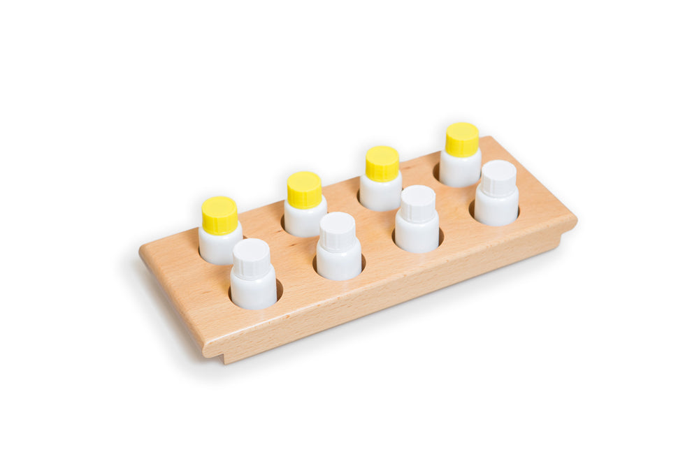 This set of 4 pairs of bottles with lids on a wooden stand refines a child's olfactory sense and memory, and aids the vital skill of concentration.