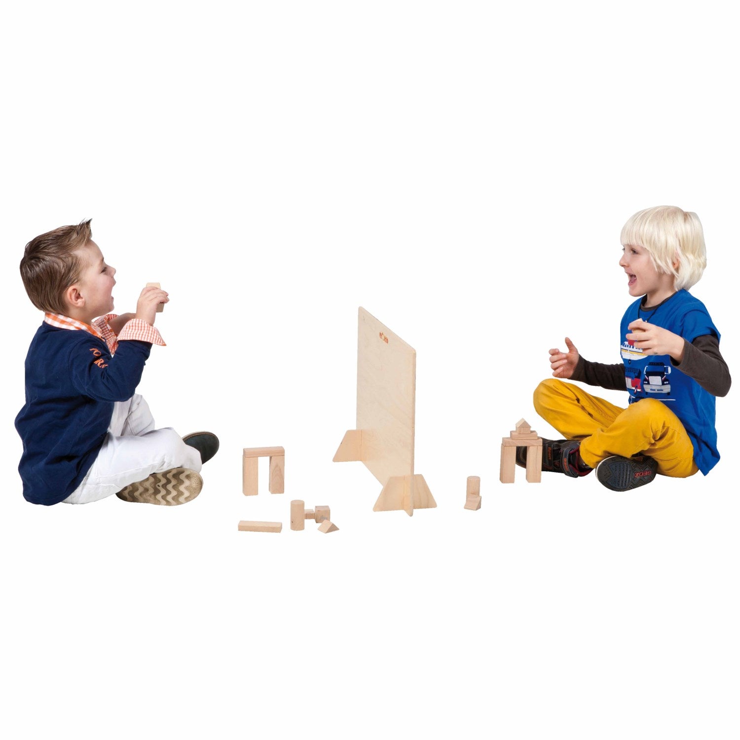 The dividing wall helps to build teamwork, vocabulary, communication and careful listening skills. Using two equal sets of objects on each side of the wall, children must focus on giving and following only verbal cues to build or arrange the same thing. When finished, the wall can be removed to see if both turned out the same.
