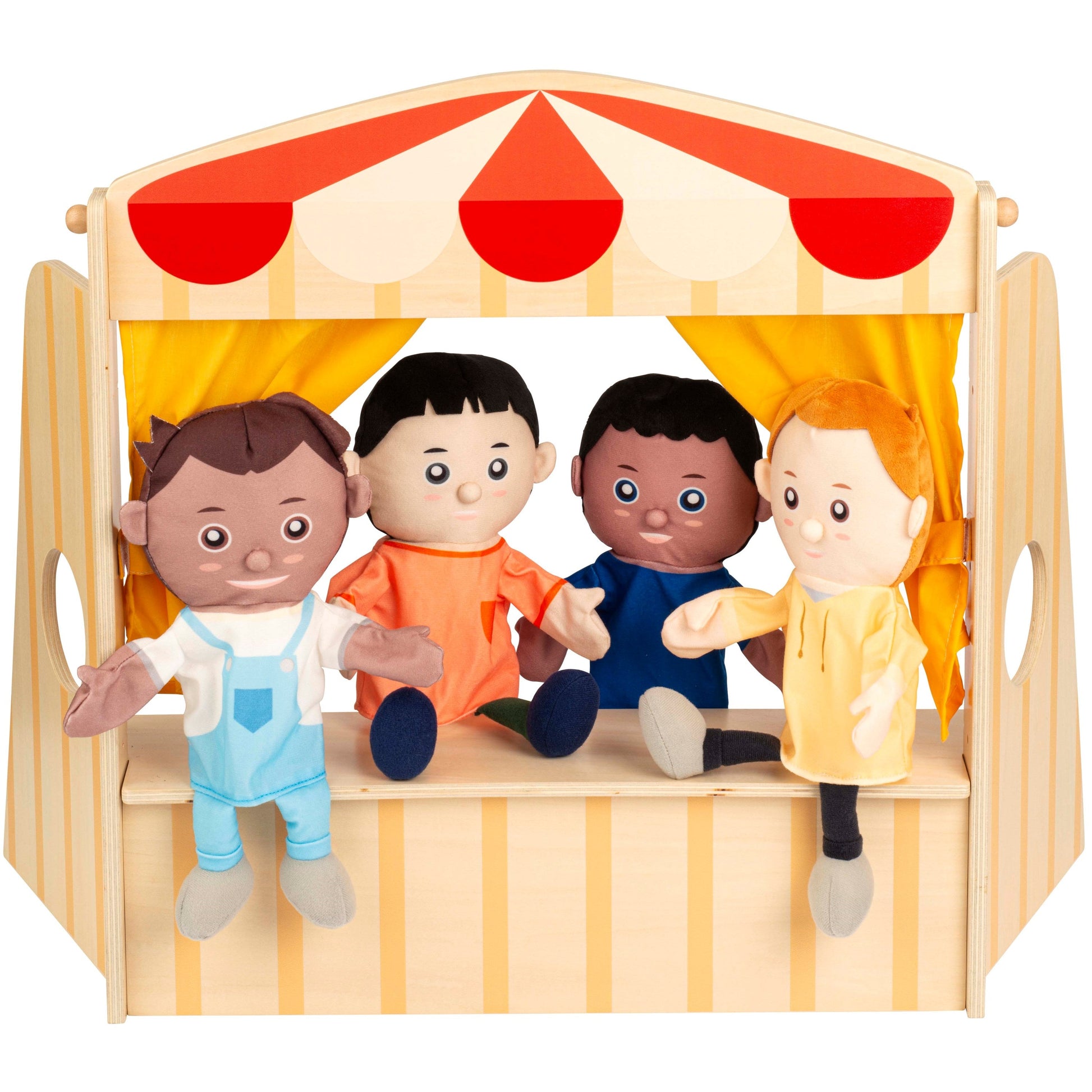 A set with a variety of puppets with which children can imitate all kinds of situations. The set can be used in combination with the puppet theatre.