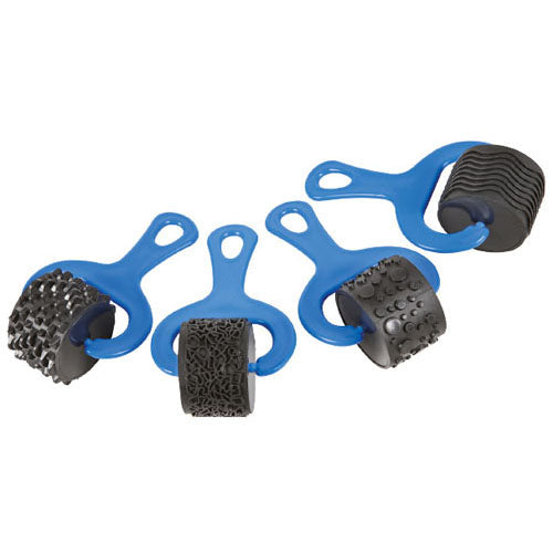 Set of 4 paint and clay rollers. Designs: 8-line wavy, small, medium and large dots, lace-like squiggles and 7-line dots, dashes and arcs. With durable plastic comfortgrip handle. Rollers are easy to clean. Design size: 3.81 cm.