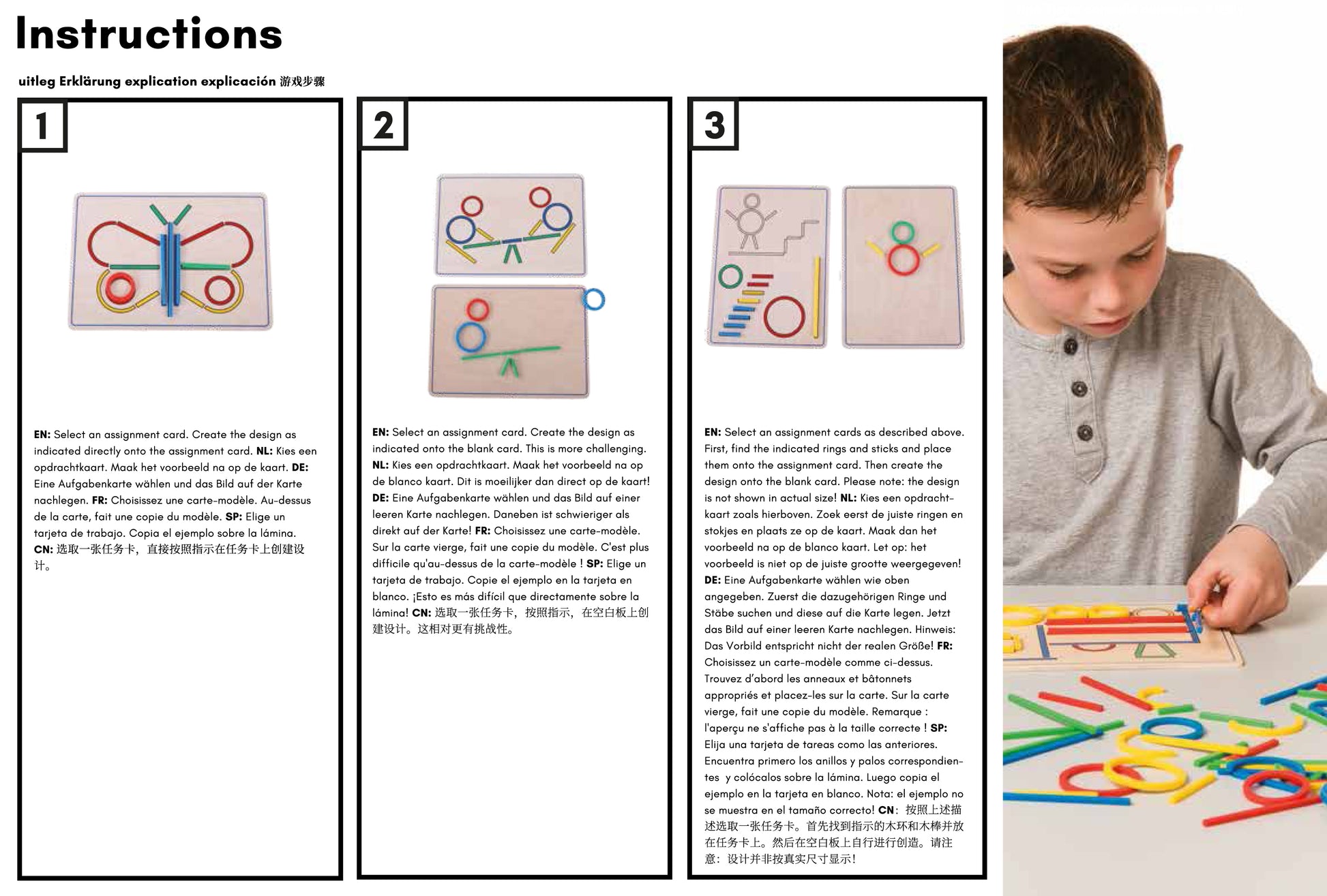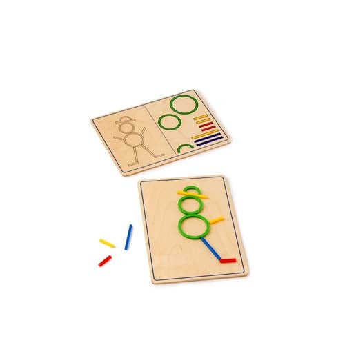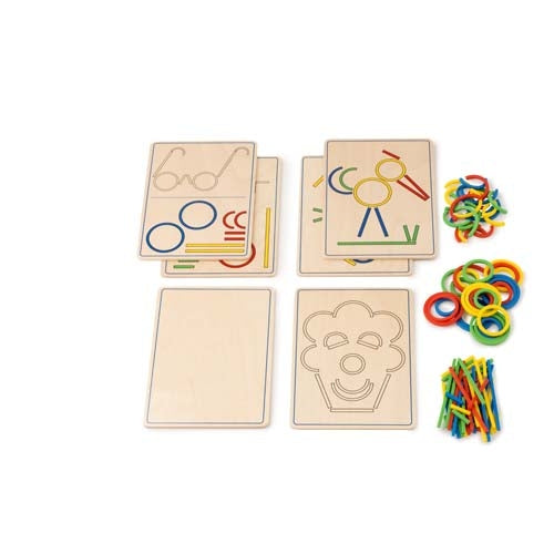 Create the figures of the assignment cards with the rings and sticks or create your own. Compare various colours and sizes. Stimulate fine motor skills and visual analysis.