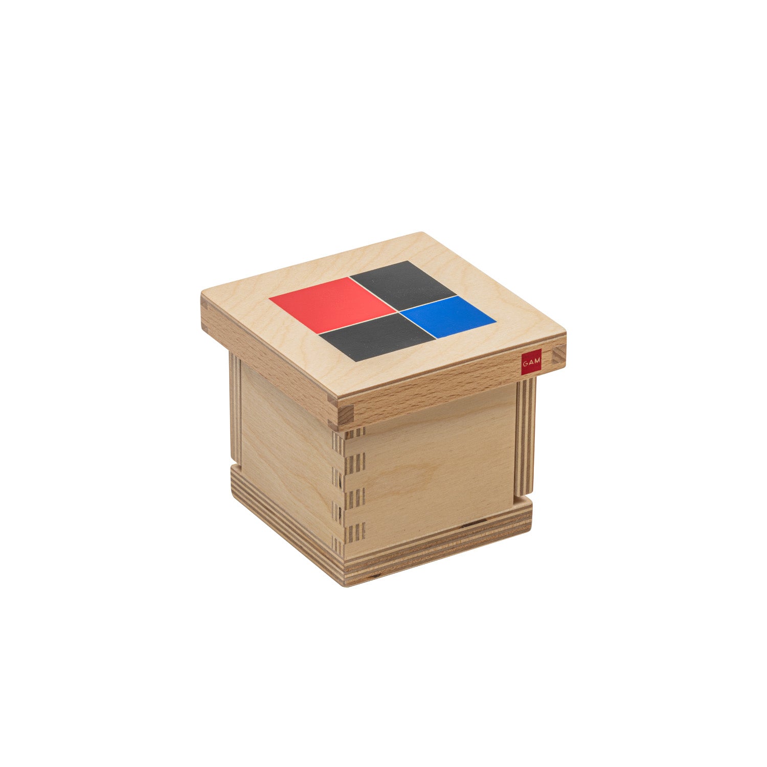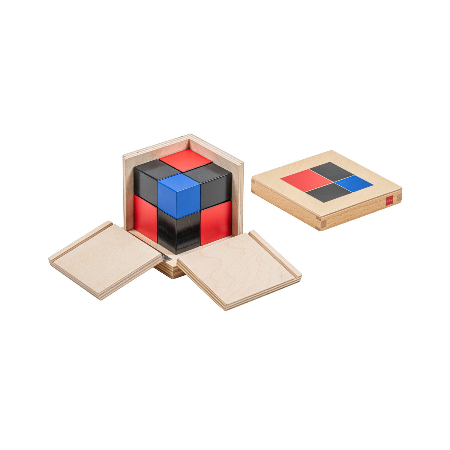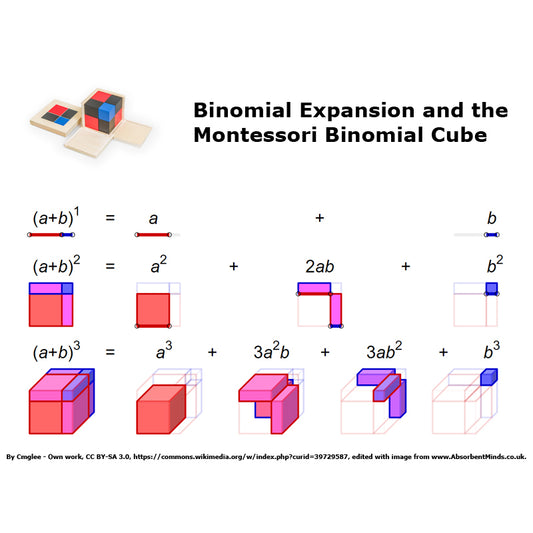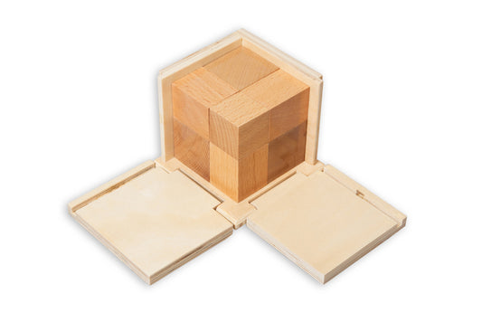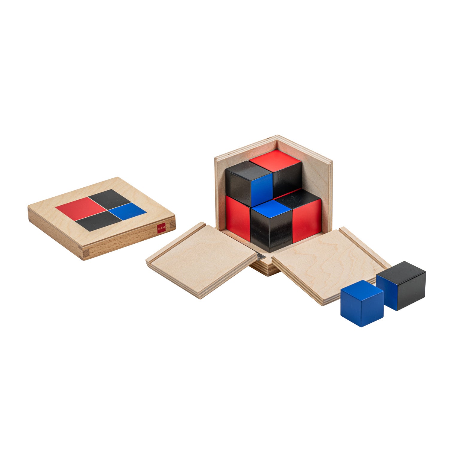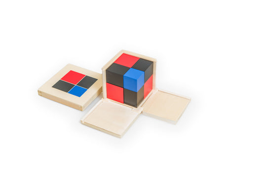 The Binomial Cube is a concrete representation of the algebraic formula (a + b)³. The factors of the equation are represented by cubes and prisms. The elementary Montessori child uses the Binomial Cube as an activity of algebraic exploration. Contained in a hinged wooden box with lid.