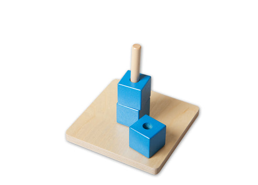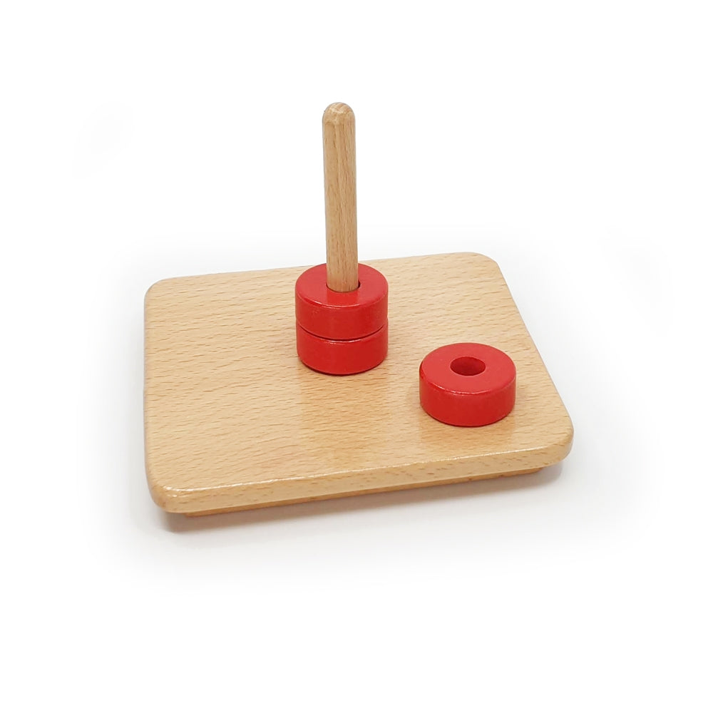 Three coloured discs are put onto the vertical dowel. Colours may vary.