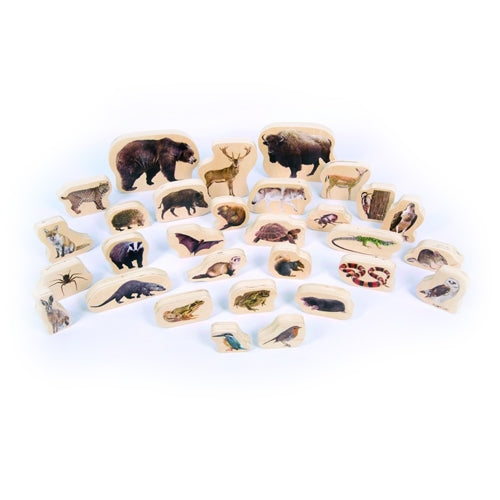 30 double sided wooden blocks with real images of animals from forest and woodland habitats