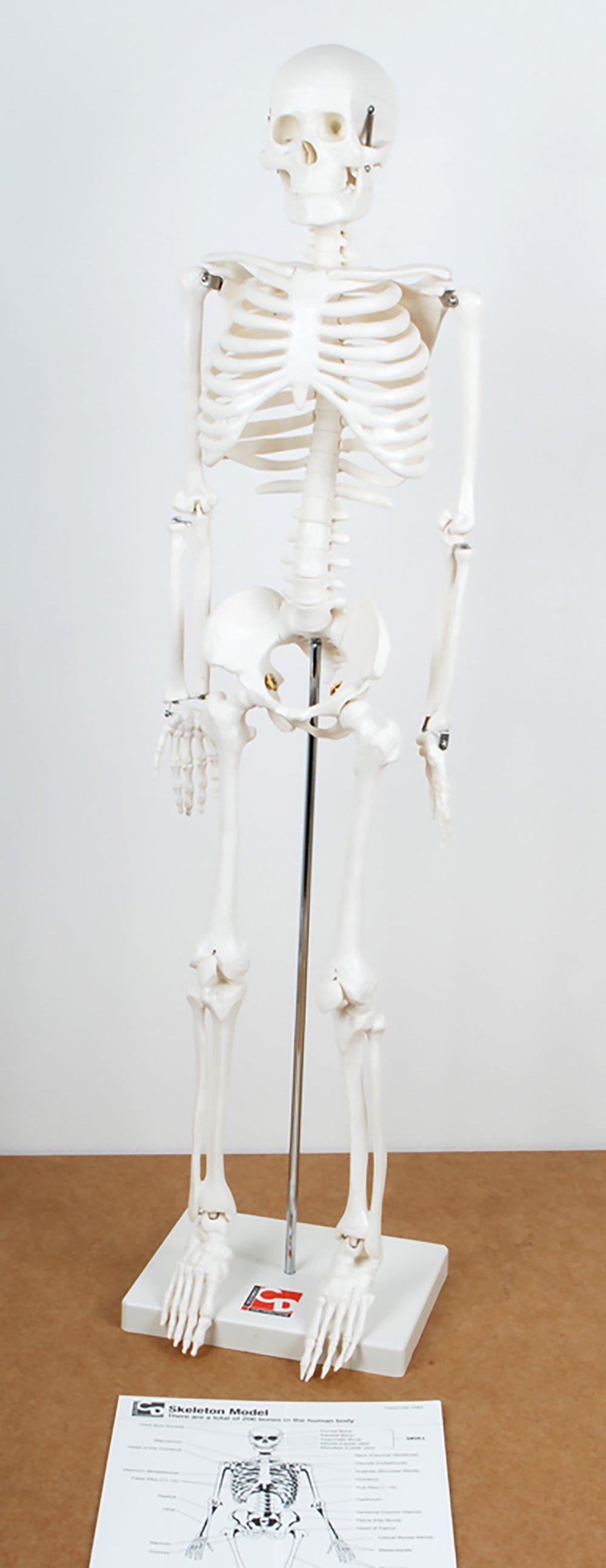 Half scale model of the human skeleton. Produced in lightweight and durable synthetic material. All of the main joints move including the shoulder, elbow, wrist, hip, knee, jaw and ankle. Supplied with heavy metal stand.