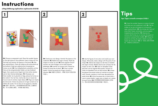 Happy hammer geo set. Create mosaic designs with geometric shapes in various colours. Model one of the 12 assignment cards or make up your own unique creations. Improve fine motor skills and hand-eye coordination.