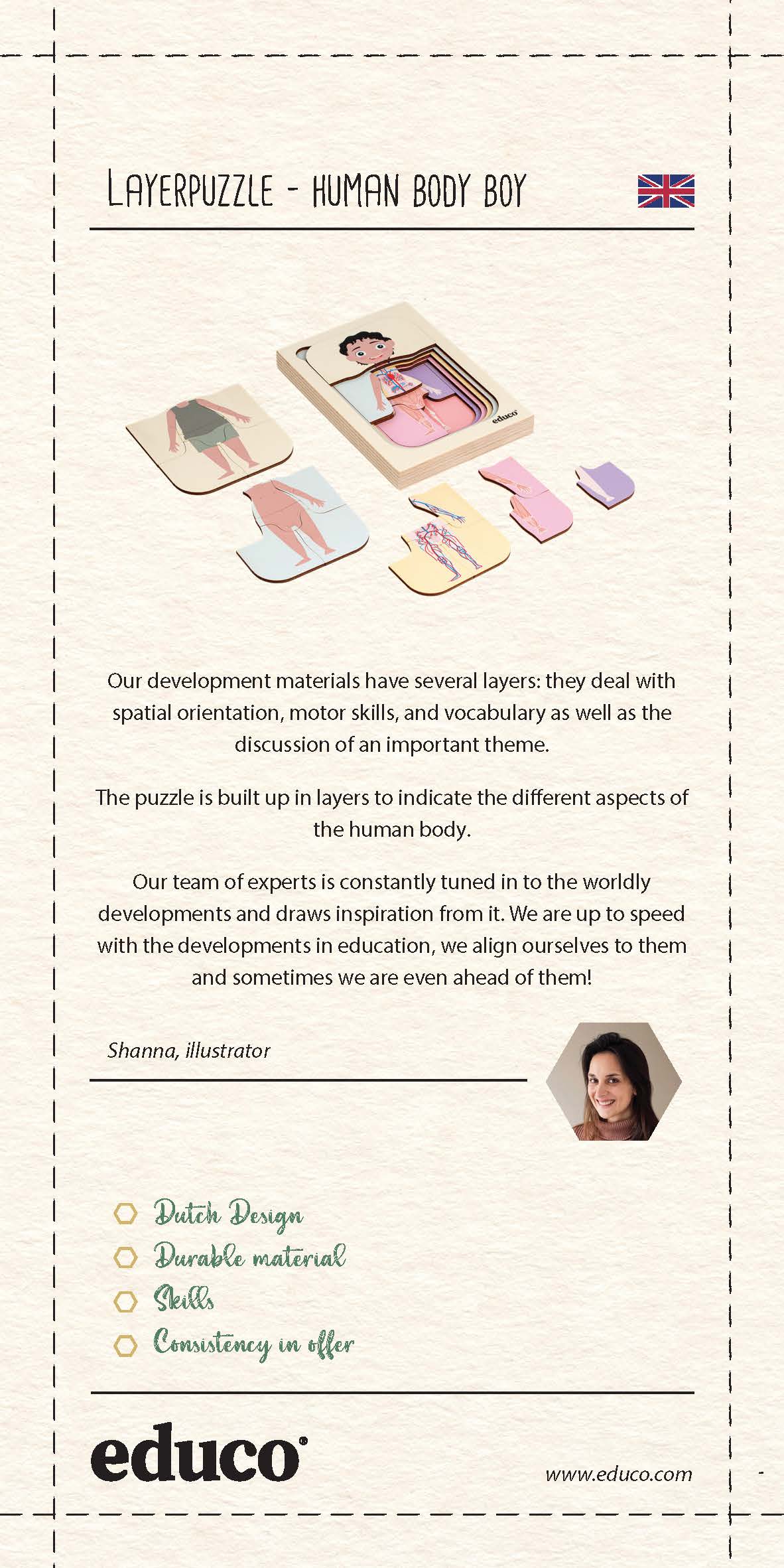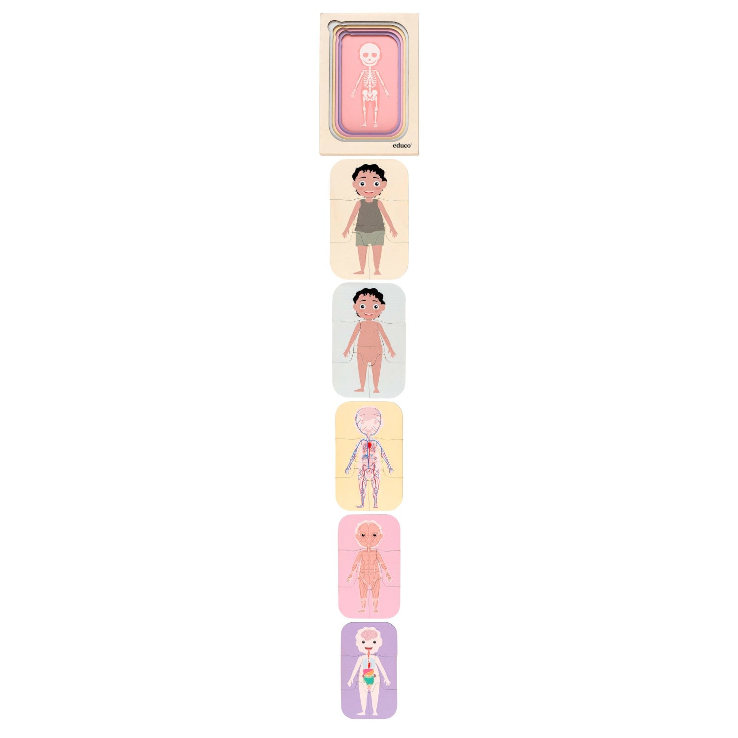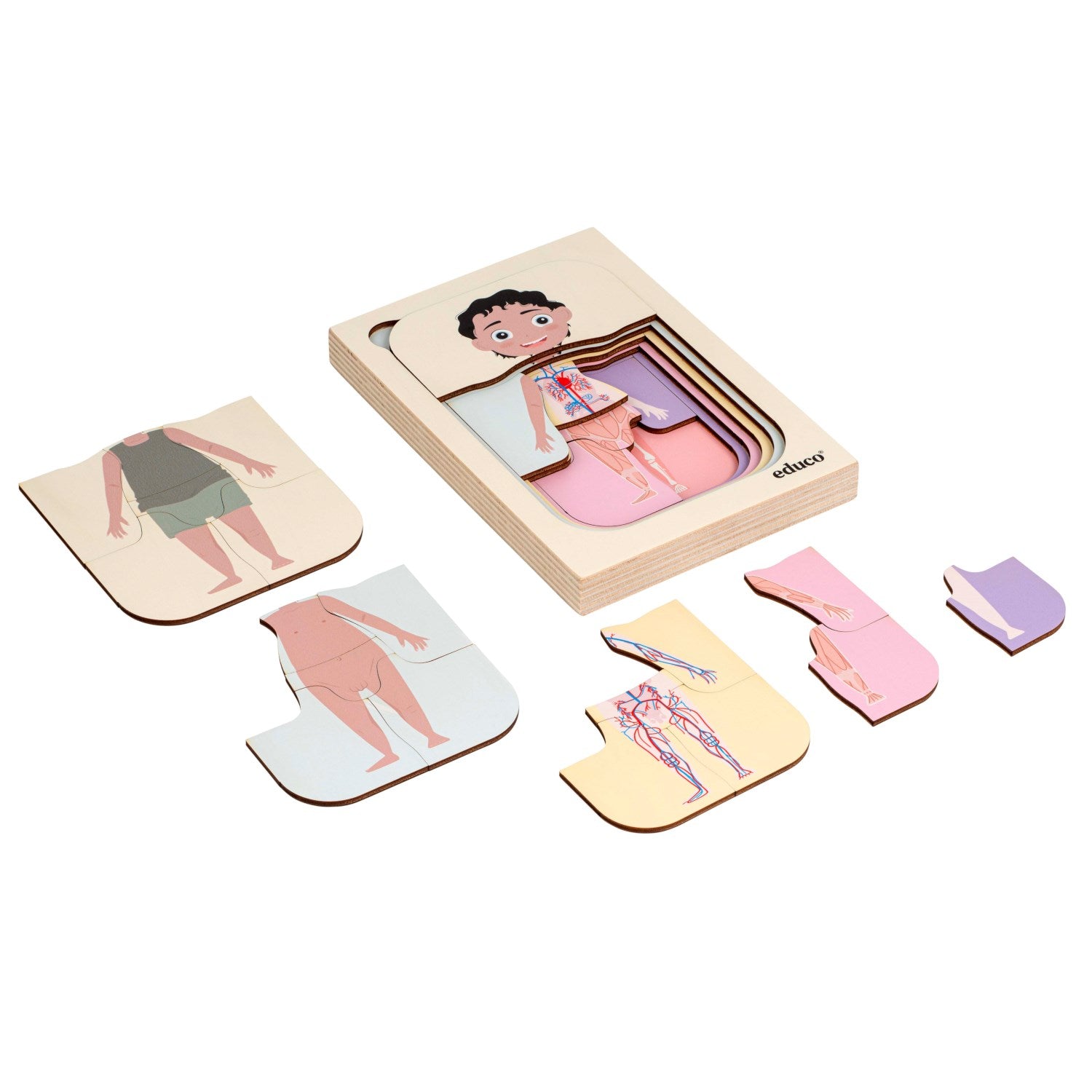 A body puzzle in 6 layers. At the bottom is the skeleton, with the organs, muscles, blood circulation, skin and clothes added in order.
