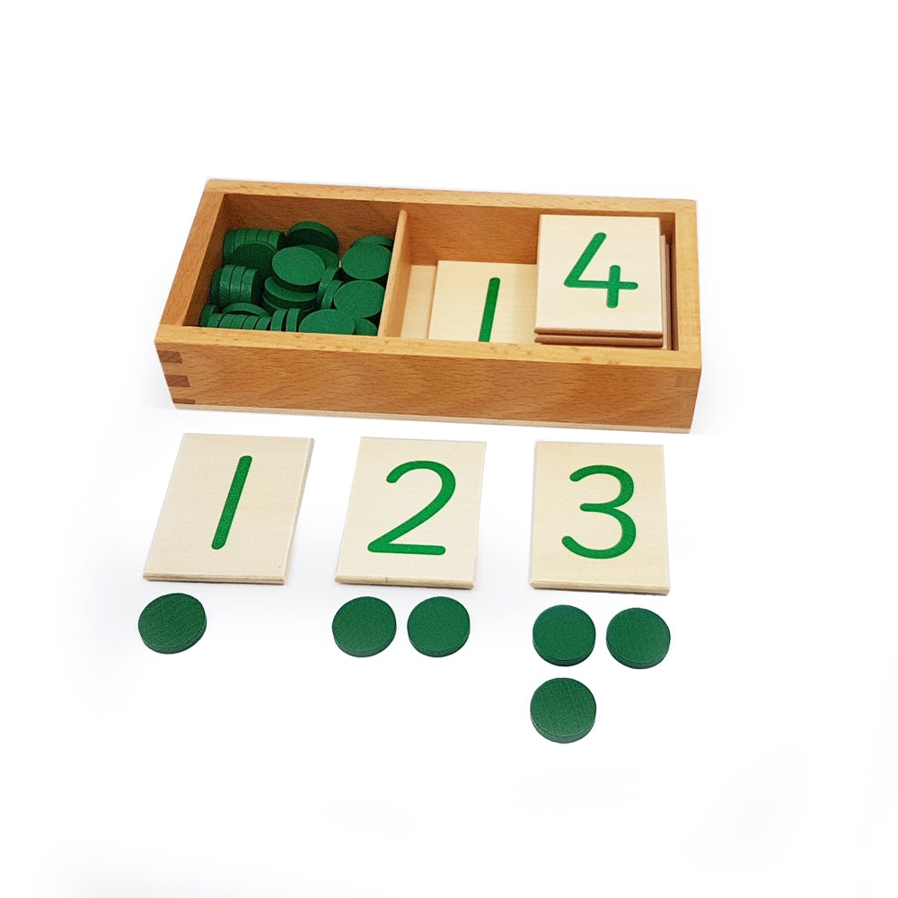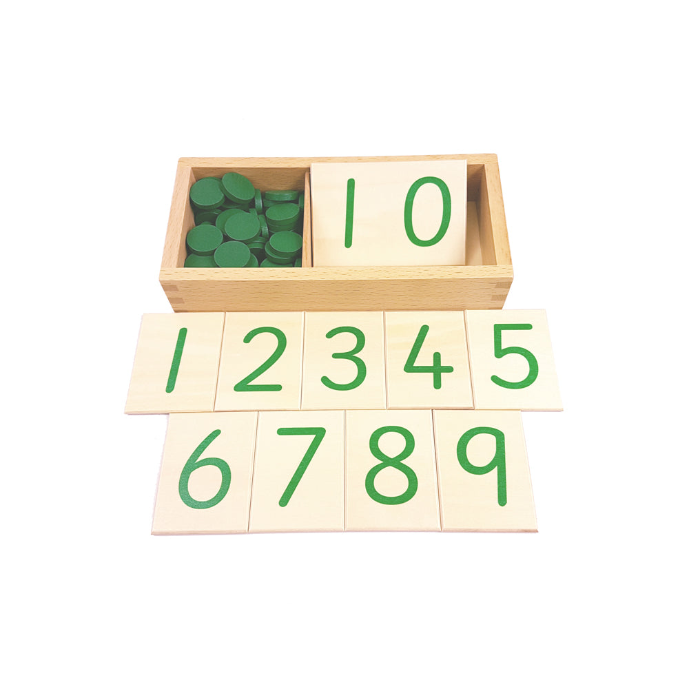 The wooden number cards 1-10 and 55 green wooden counters are stored in a wooden box with two compartments and a lid.