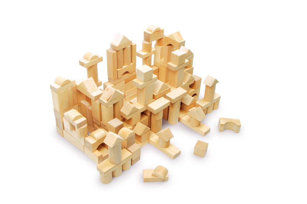 100 natural finished, smooth-sanded wood blocks in a linen bag for easy storage. Ideal for building and creative play.