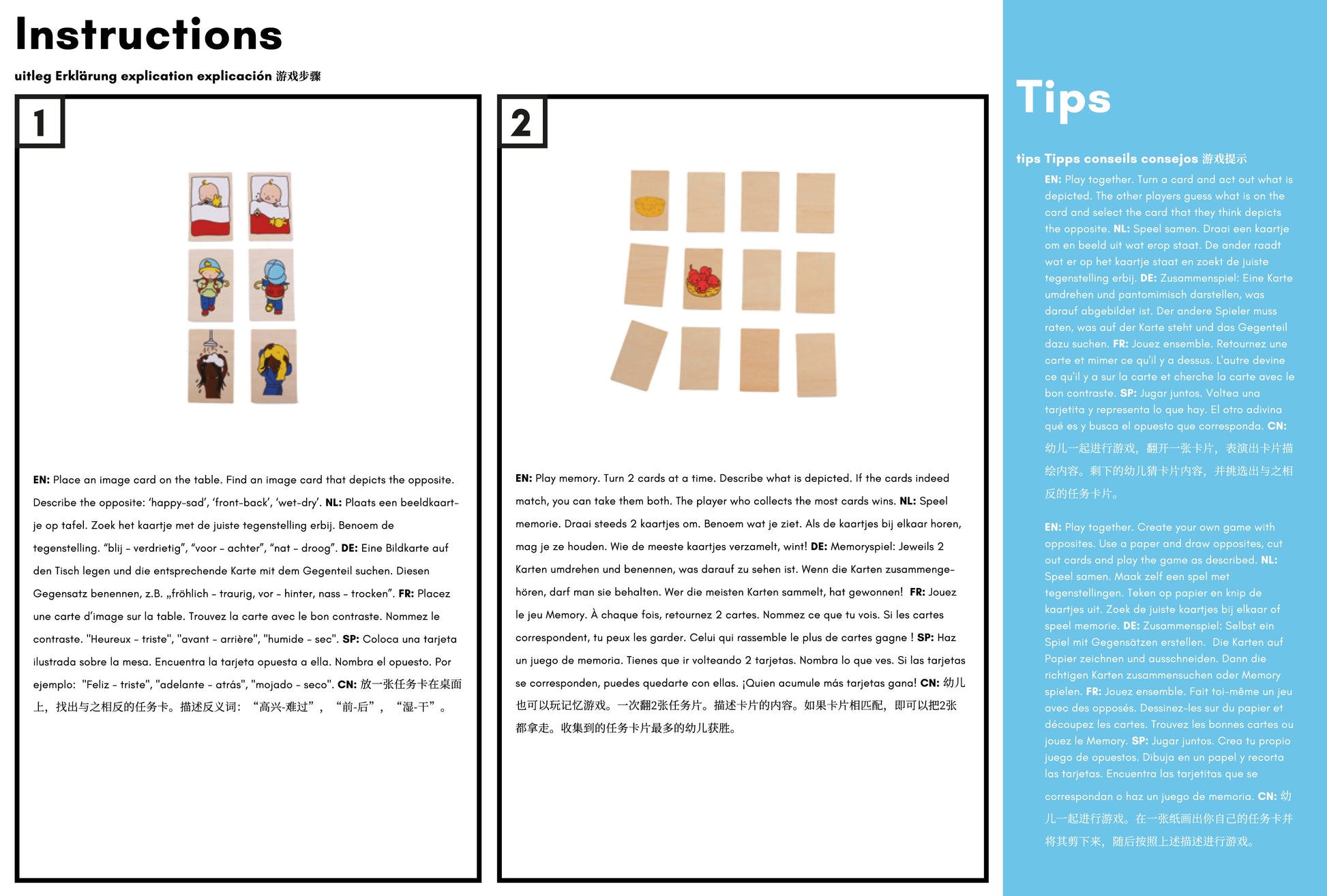 Collect pairs of cards which are opposites of each other. Describe and name what you see and improve vocabulary.