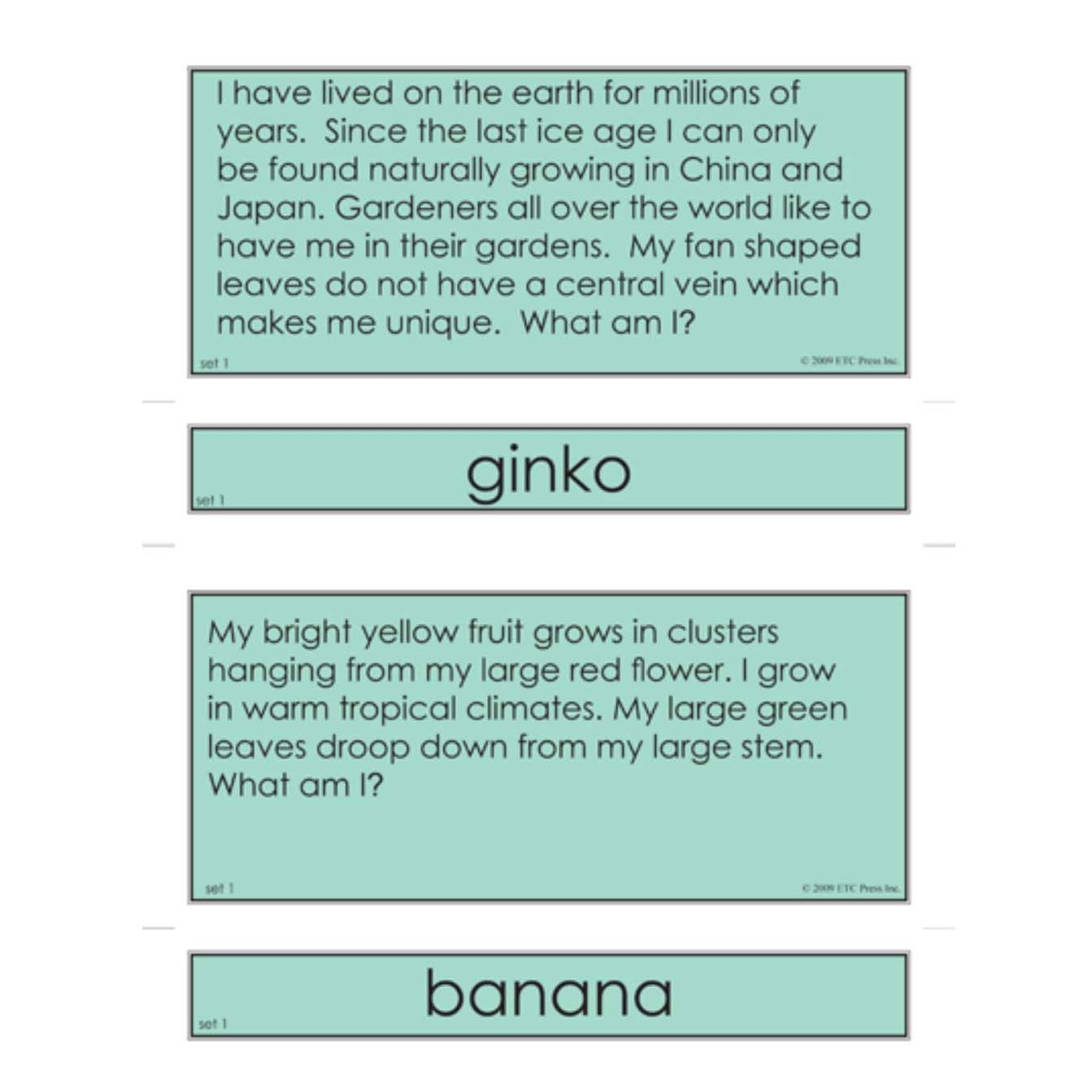 These cards provide the first knowledge of plants leading to the classification of plants in the plant kingdom. Set contains 40 different plant pictures, 40 plant stories, and additional questions. Printed on heavy cardstock in full color, the pictures and stories are coordinated with the pictures shown in our Plant Kingdom Chart (ELC-4058). We have used actual pictures in creating this material, so that the students will have a clear understanding of the plant life they are studying. Pictures and stories for the following plants: