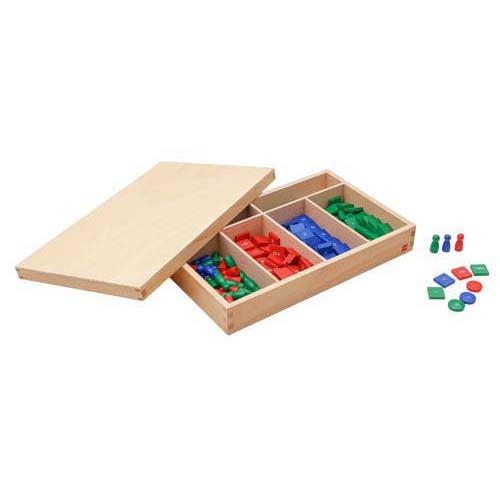 After being introduced to the decimal system using the Golden Bead Material, the Stamp Game provides opportunity for individual practice in the operations of addition, subtraction, multiplication and division. In a step towards abstraction, the quantity and symbols of the decimal system are combined and are represented by each stamp. This material is contained in a wooden box with 6 compartments. Stamps are organized according to hierarchical colours (green, blue and red) and according to the numbers stamped on them: 1, 10, 100 and 1000. The material also includes skittles and coloured counters.