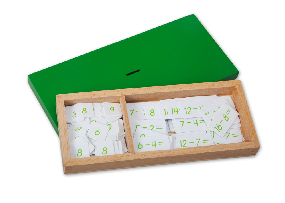 A two-compartment wooden box with lid contain tiles for all the equations for the subtractions between 1 and 18 and all the differences. This box is used with the Subtraction Working Charts.