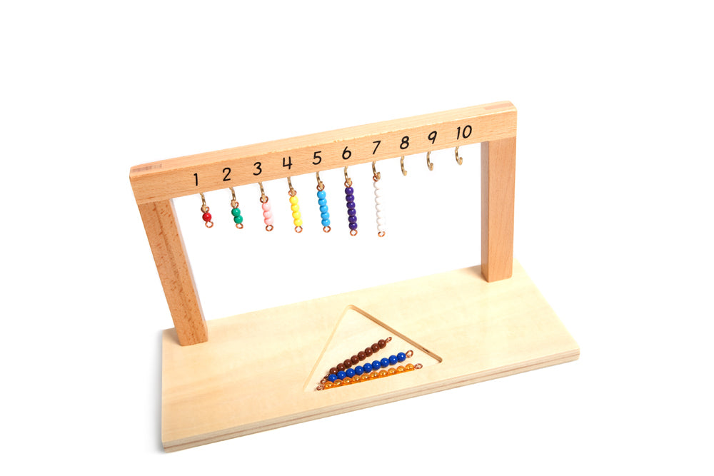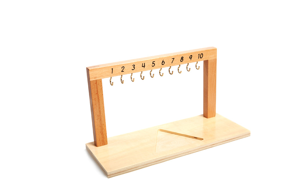 The hanging frame teaches the child the number names, symbols and sequence from 1 to 10. It is ideal for use with the Montessori coloured bead stair and a tens bead bar.