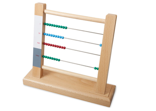 The Large Bead Frame is a step towards abstraction for addition, subtraction and multiplication exercises. There are 7 rows of colour coded beads representing, units, tens, hundreds; thousands, ten thousands, hundred thousands; and millions.