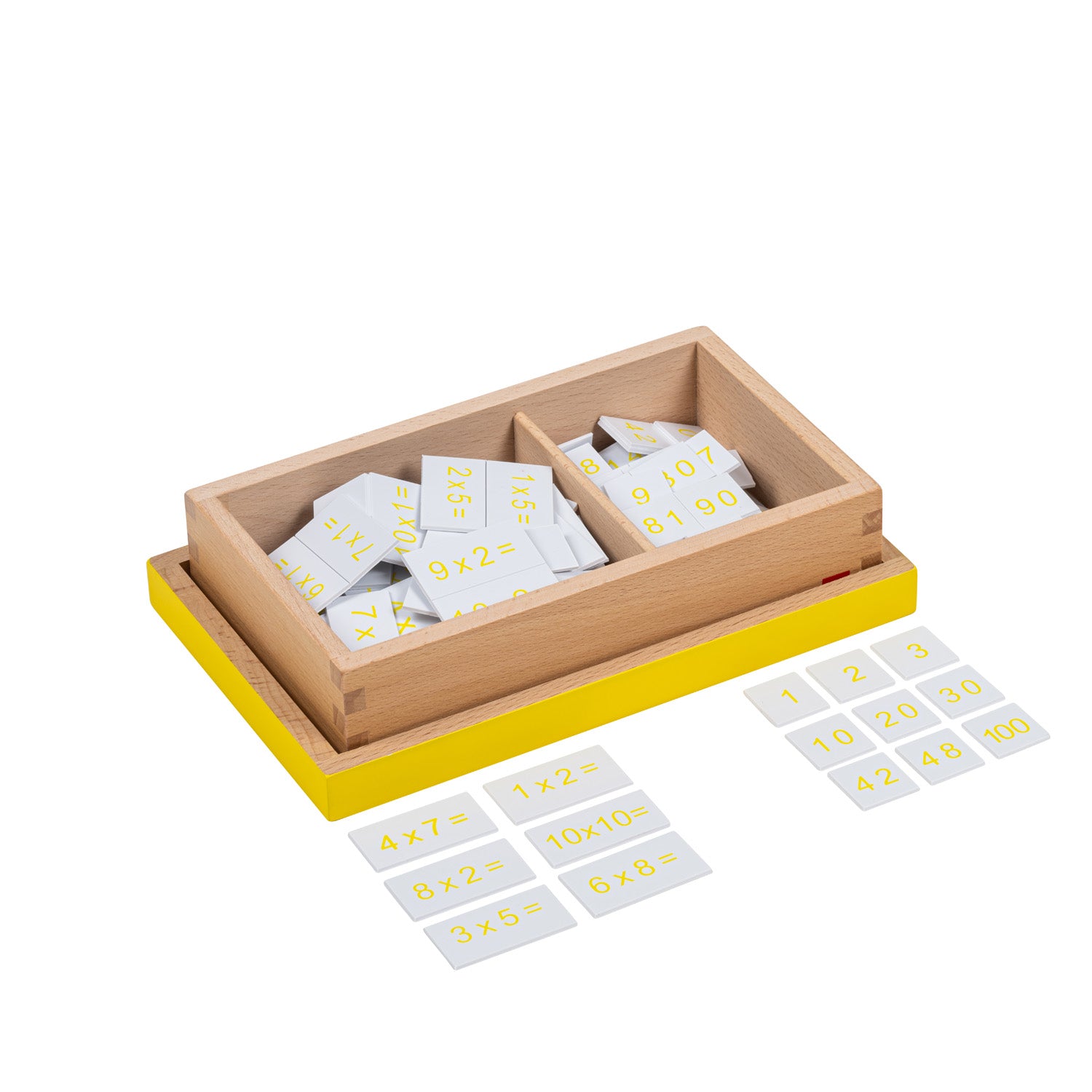 This 2-compartment wooden box with lid contains plastic chips, 1 set with equations printed on them and 1 set with the answers to be used with the Multiplication Working Charts. All the equations and products for the multiples 1-10 are included.