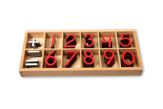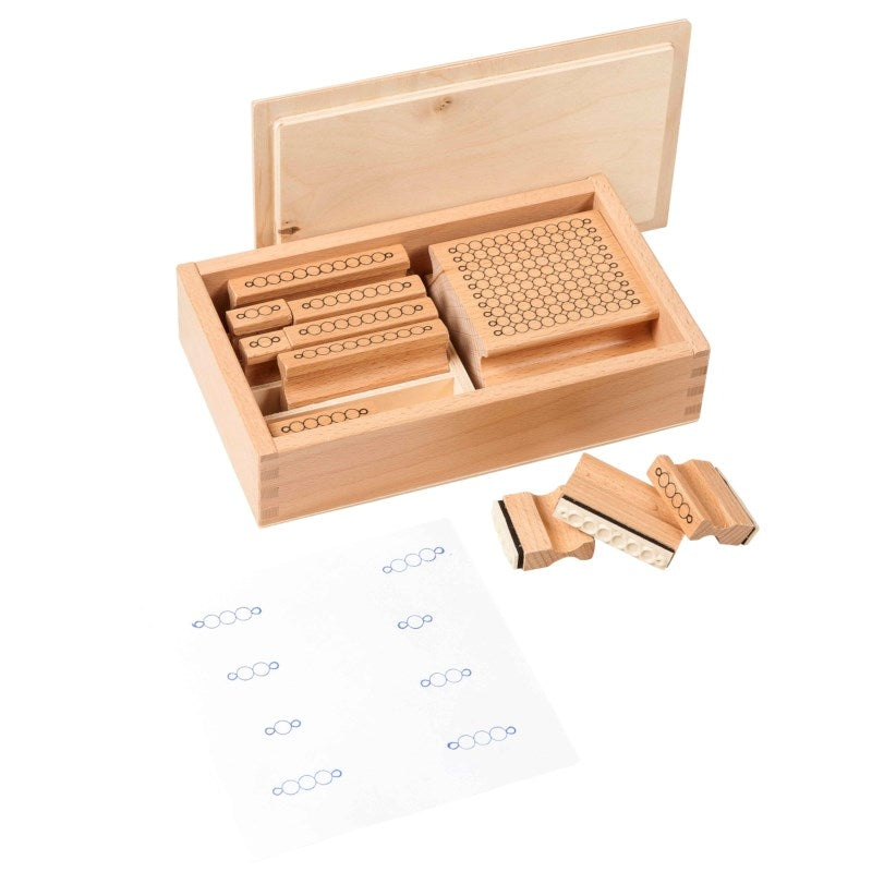 A set of rubber stamps representing the Montessori hundred square and bead bars from 1–10. An excellent supplementary method for further practice of the operations performed with the Montessori bead material.