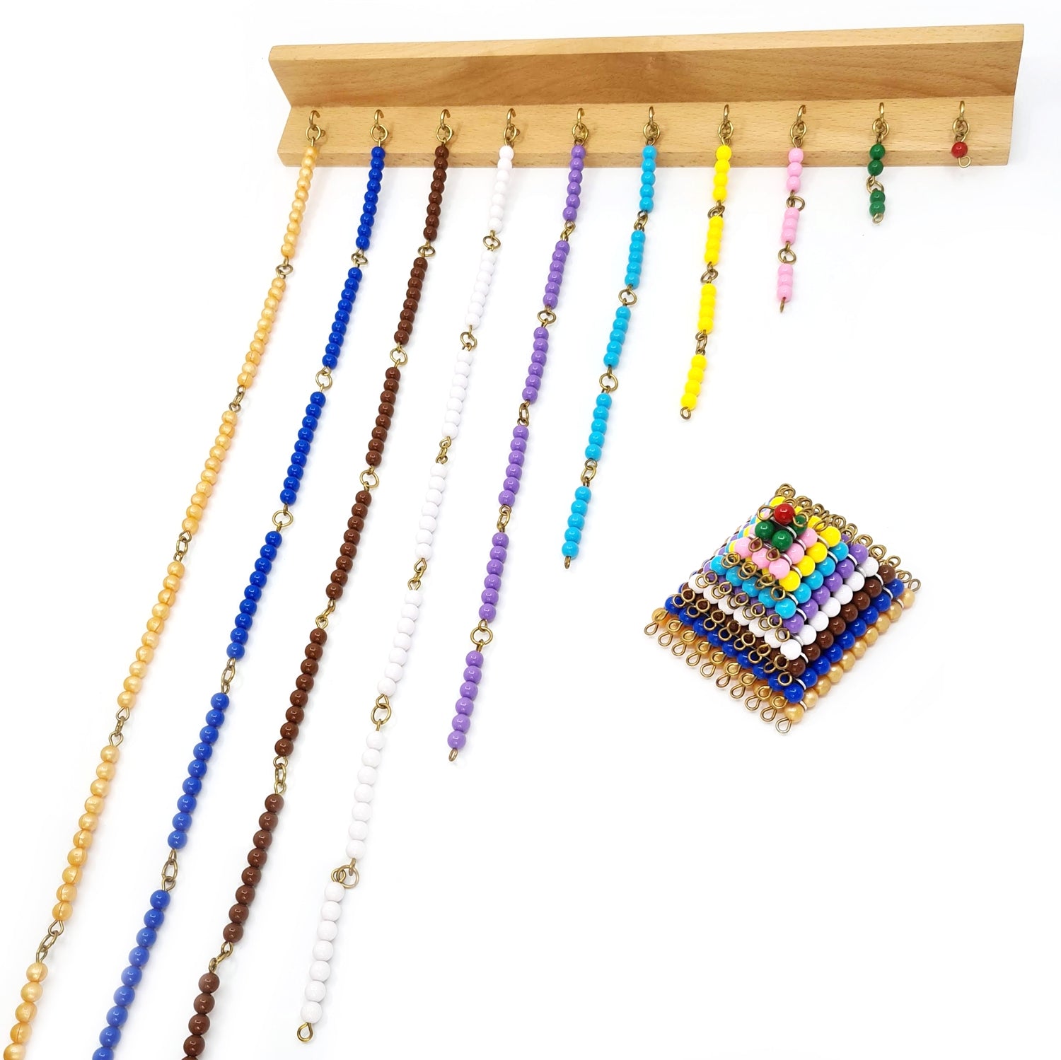 The short bead chains form part of the Montessori approach to multiplication. This set includes a bead square for each number 1 to 10 and the frame and shelf on which to hang the beads.