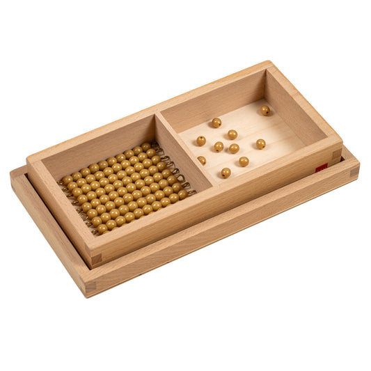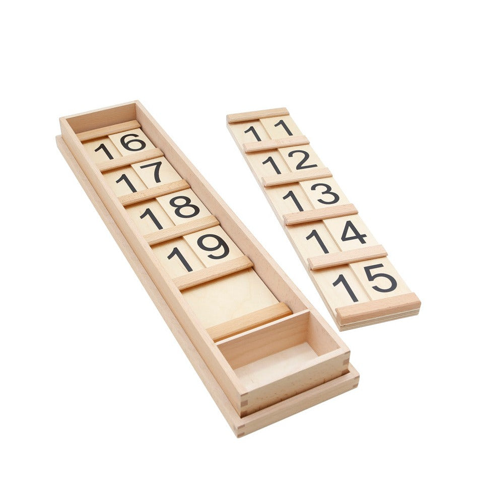 Includes a wooden box with lid containing 2 Tens Boards and 9 wooden cards printed with the numerals 1-9. 1 board has five printed '10' slots, the other has four printed '10' slots.