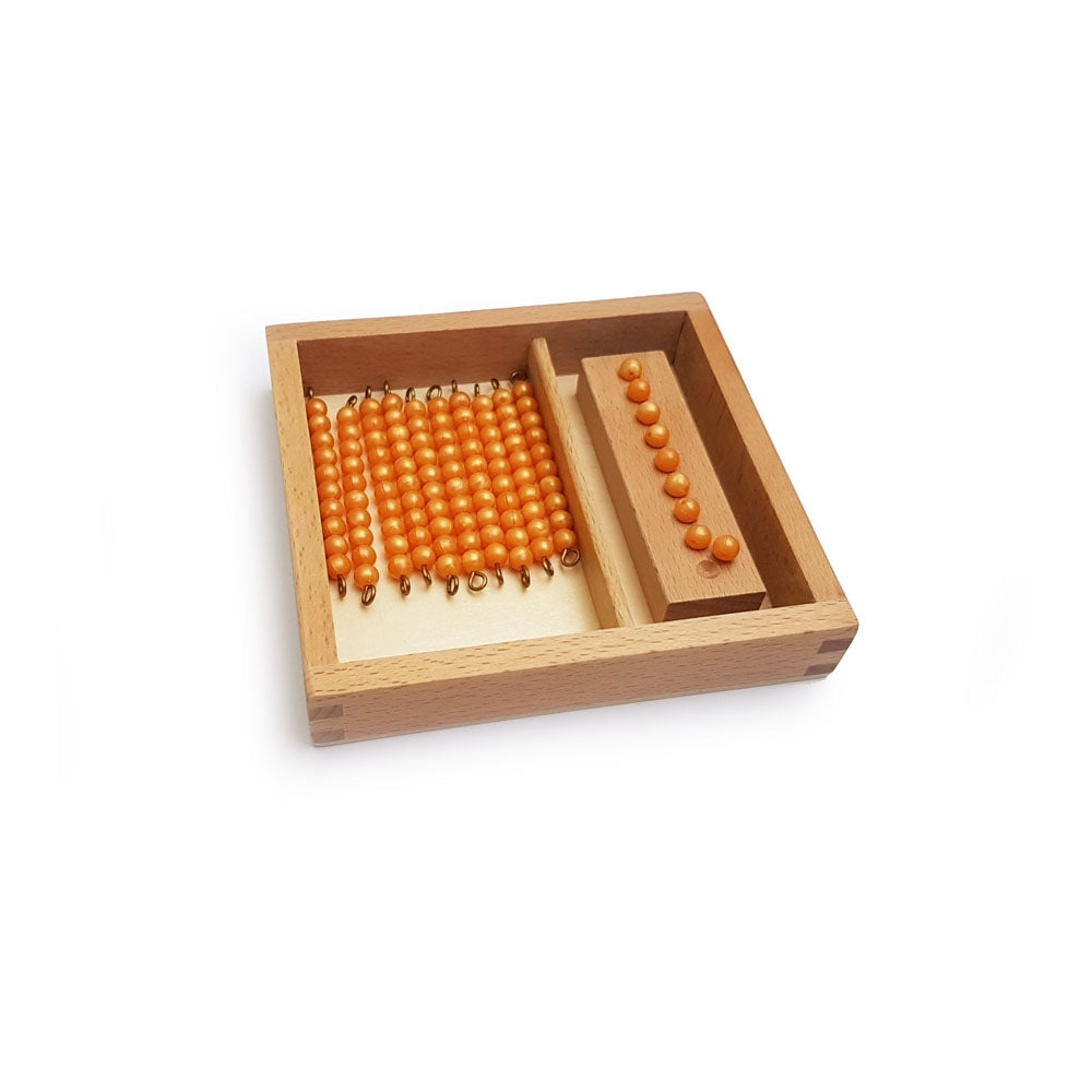 9 tens bead bars and 9 individual beads to make the numbers 10 - 99 in a wooden box and a wooden block to hold 9 unit beads.