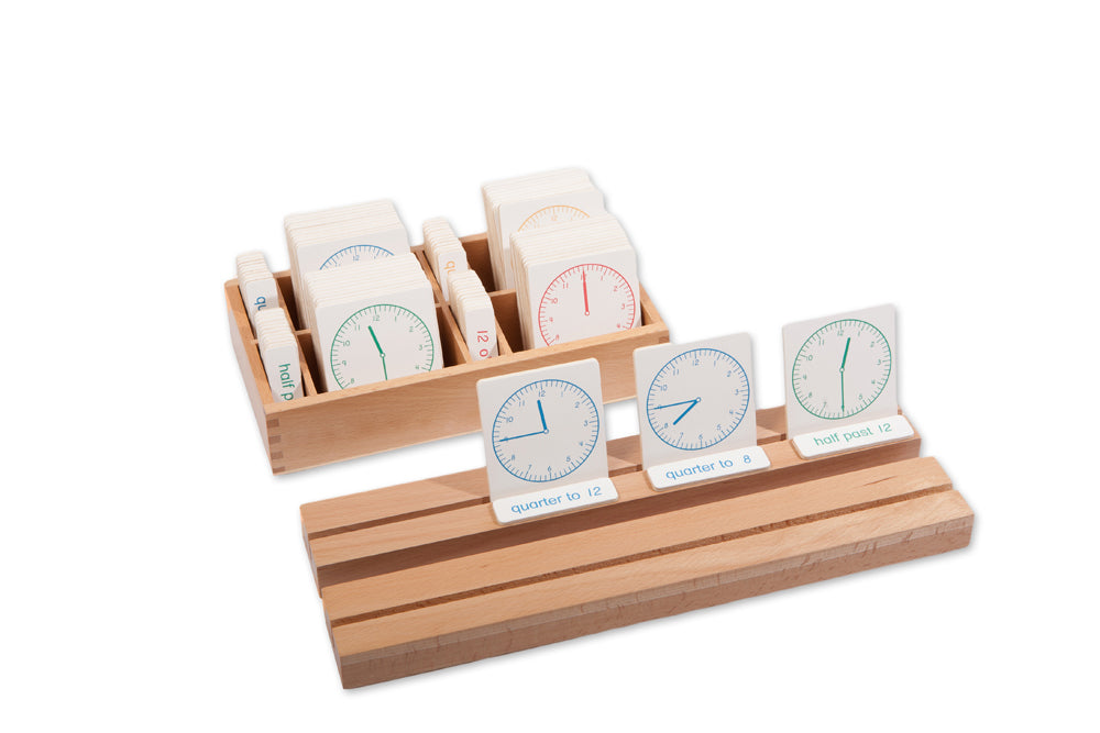 An excellent way to demonstrate time telling to a child, these cards show the o'clock, quarter past, half past and quarter to times. The child must match the time card to the clock card, and can check the answer is correct by lifting up the clock card out of the stand.