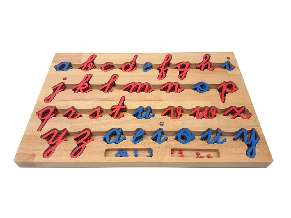 A set of cursive painted wooden letters (10 of each blue vowel and 5 of each red consonant) for word building. The letters are stored alphabetically in a box with a lid which has cut out wells configured to hold the letters neatly in place.