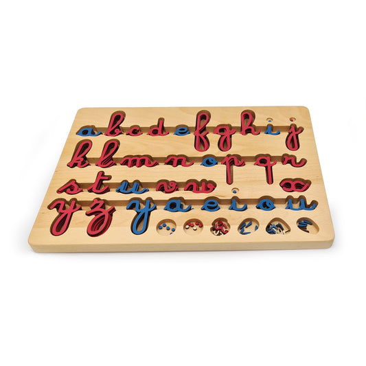A set of cursive painted wooden letters (10 of each blue vowel and 5 of each red consonant) for word building. The set also includes blue y's and accents. The letters are stored alphabetically in a box with a lid.