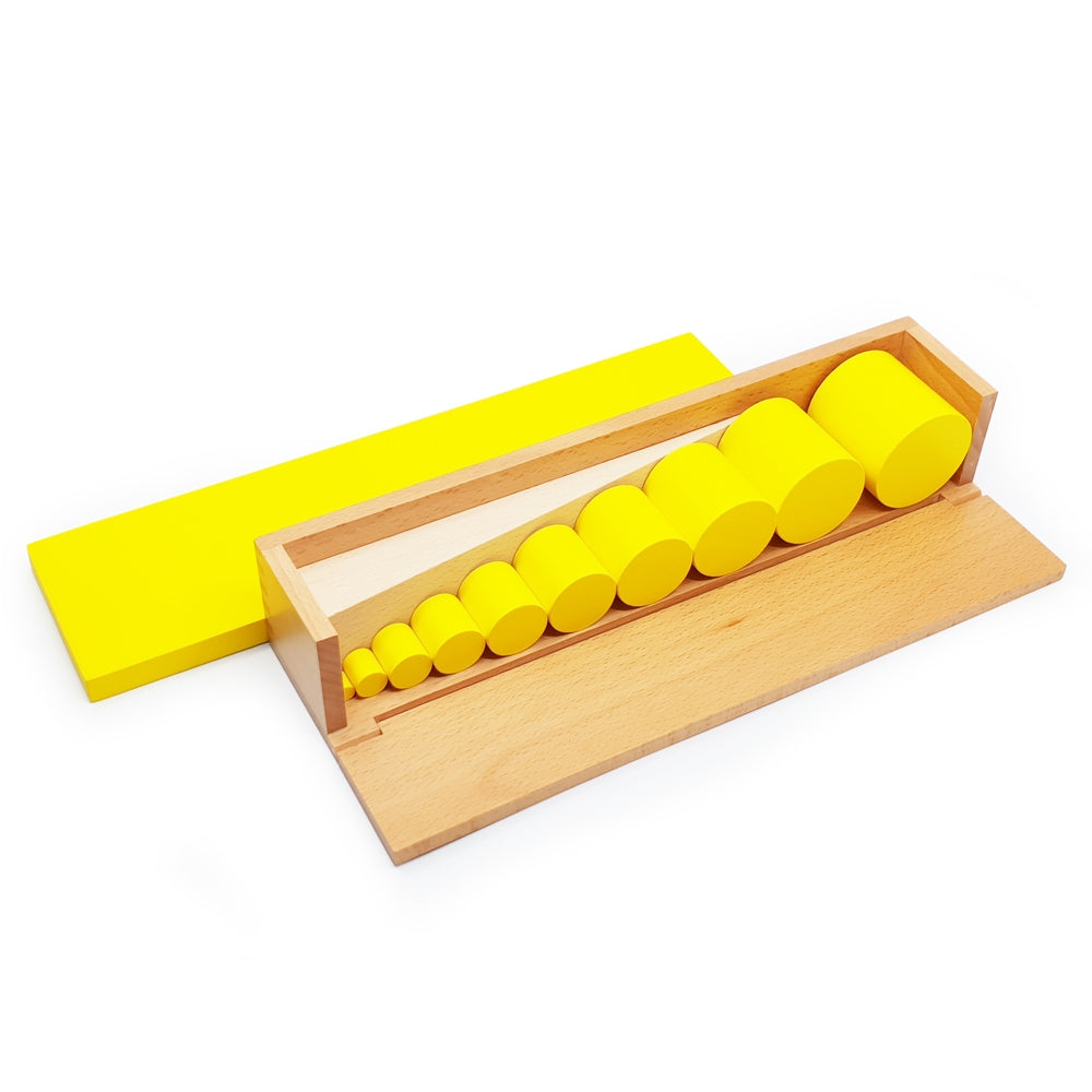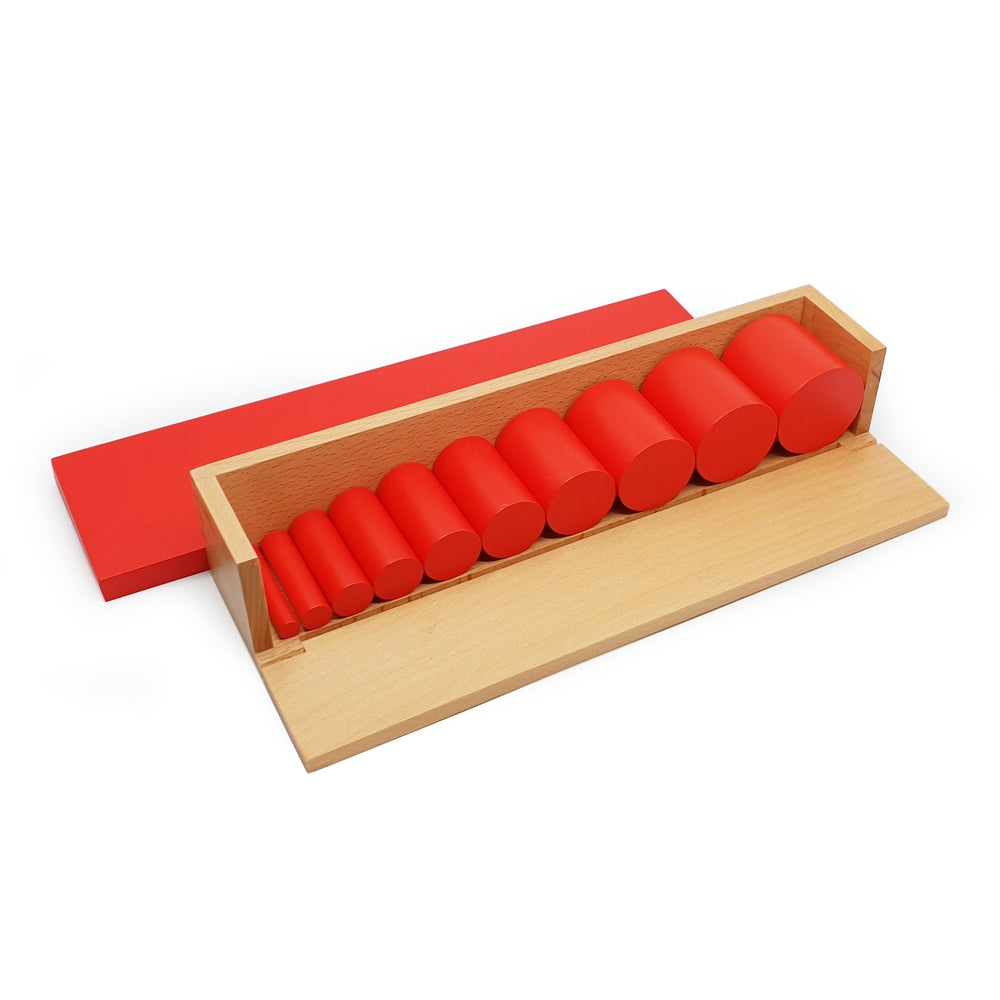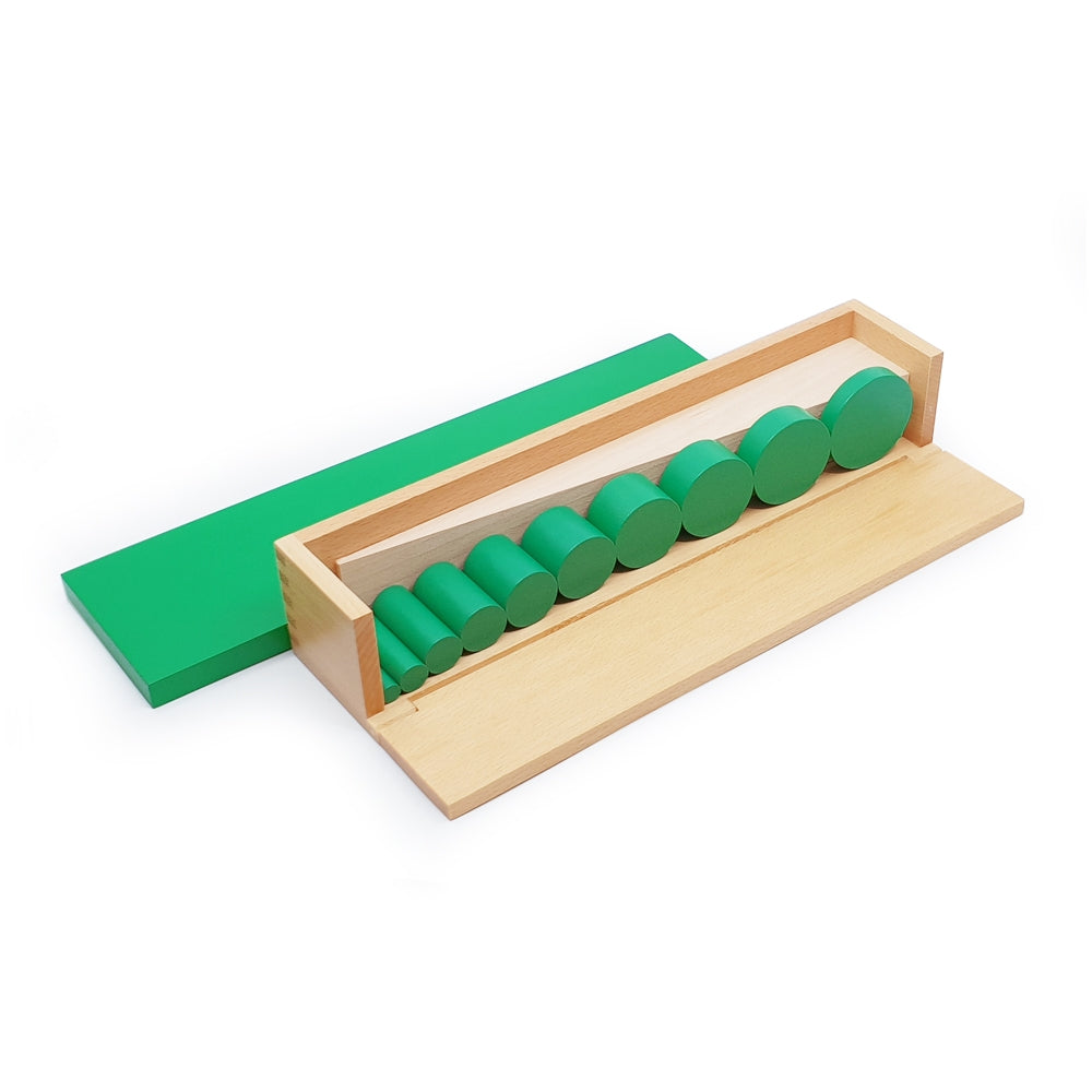 Based on early Montessori materials, the boxes allow the cylinders to be stored in order and accessed easily with the flip down side.