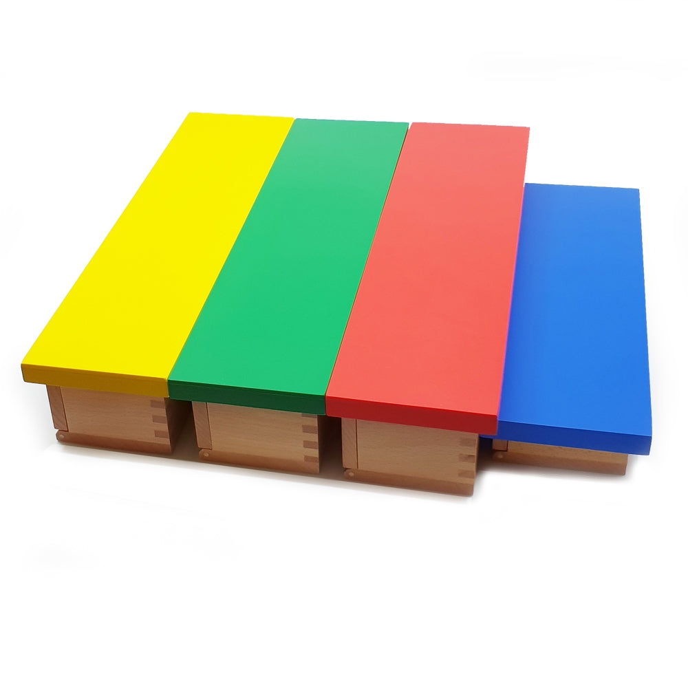 4 sets of 10 colour coded cylinders that vary in height and diameter in 4 long wooden boxes with coloured lids.