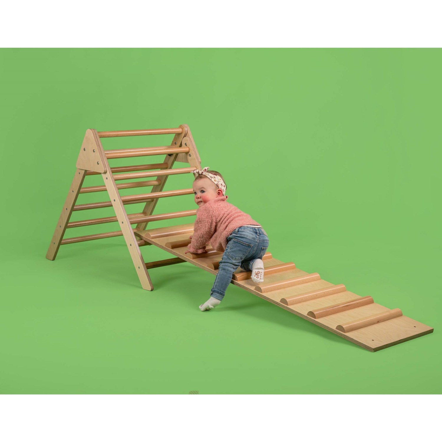 Enhance the climbing triangles with a ladder, which can be used on both sides. Create a slide, bridge, or incorporate it into a complete climbing course.