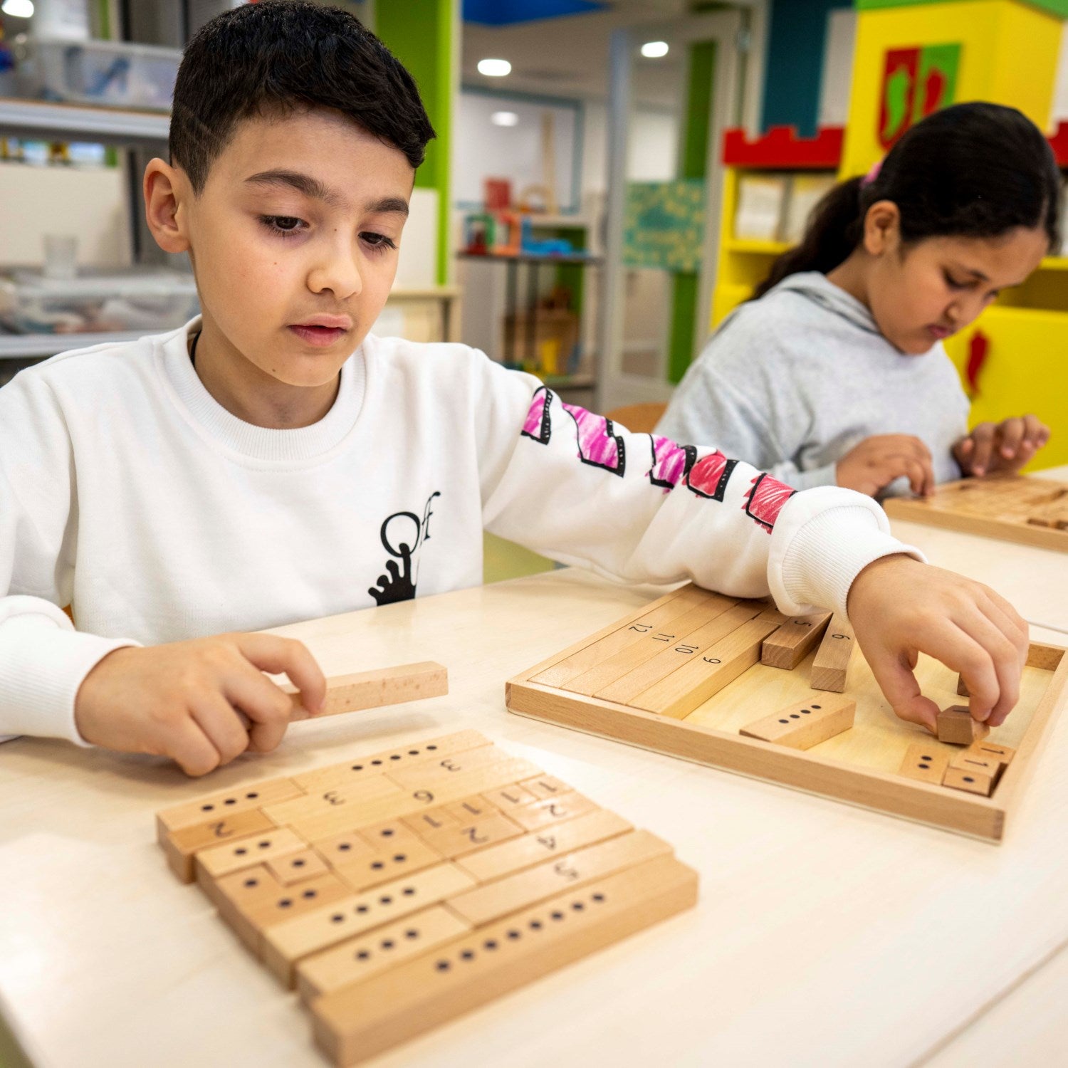With the 'Math blocks', numbers up to ten can be subtracted, divided or added in a comprehensible way. For example, the rod of 5 is as long as those of 1 and 4 or as long as those of 2 and 3, and so on.