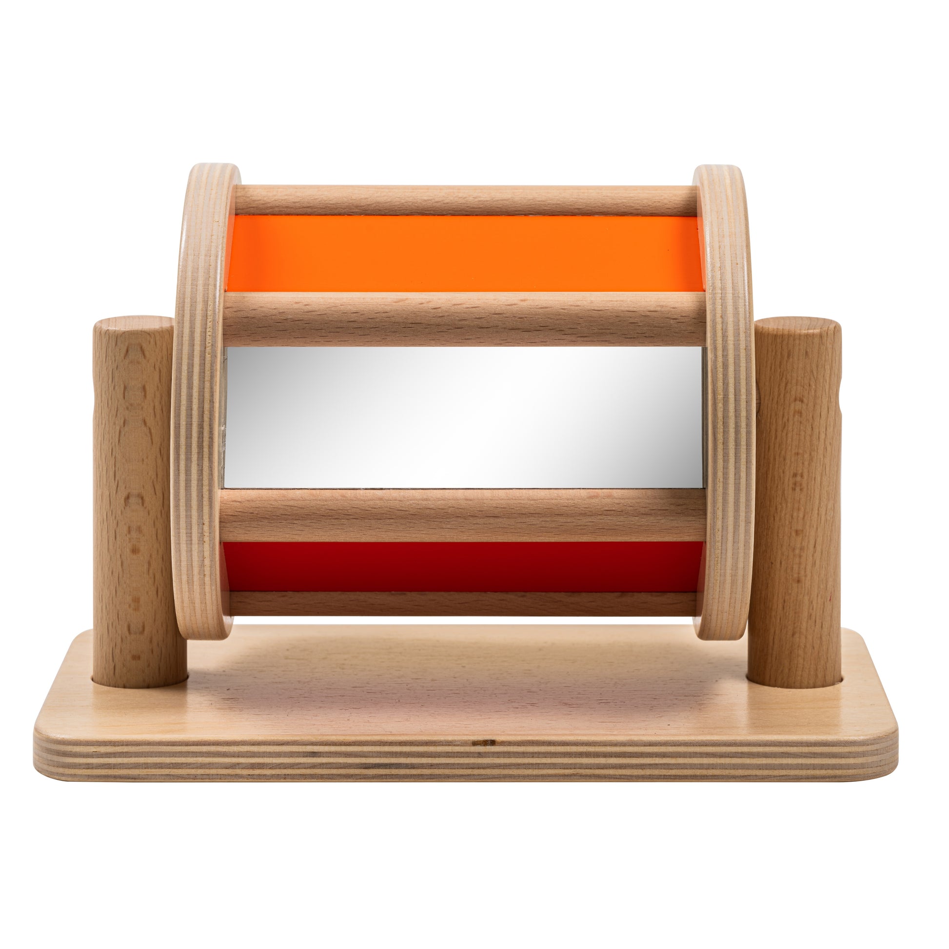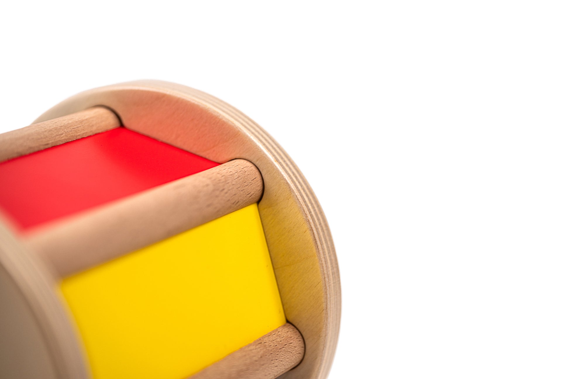 The material consists of a wooden drum with several panels of differing bright colours – one with a mirror-like surface. Through play, the child is mesmerized by the beautiful bright colours and fascinated upon seeing their own face reflected in the drum.