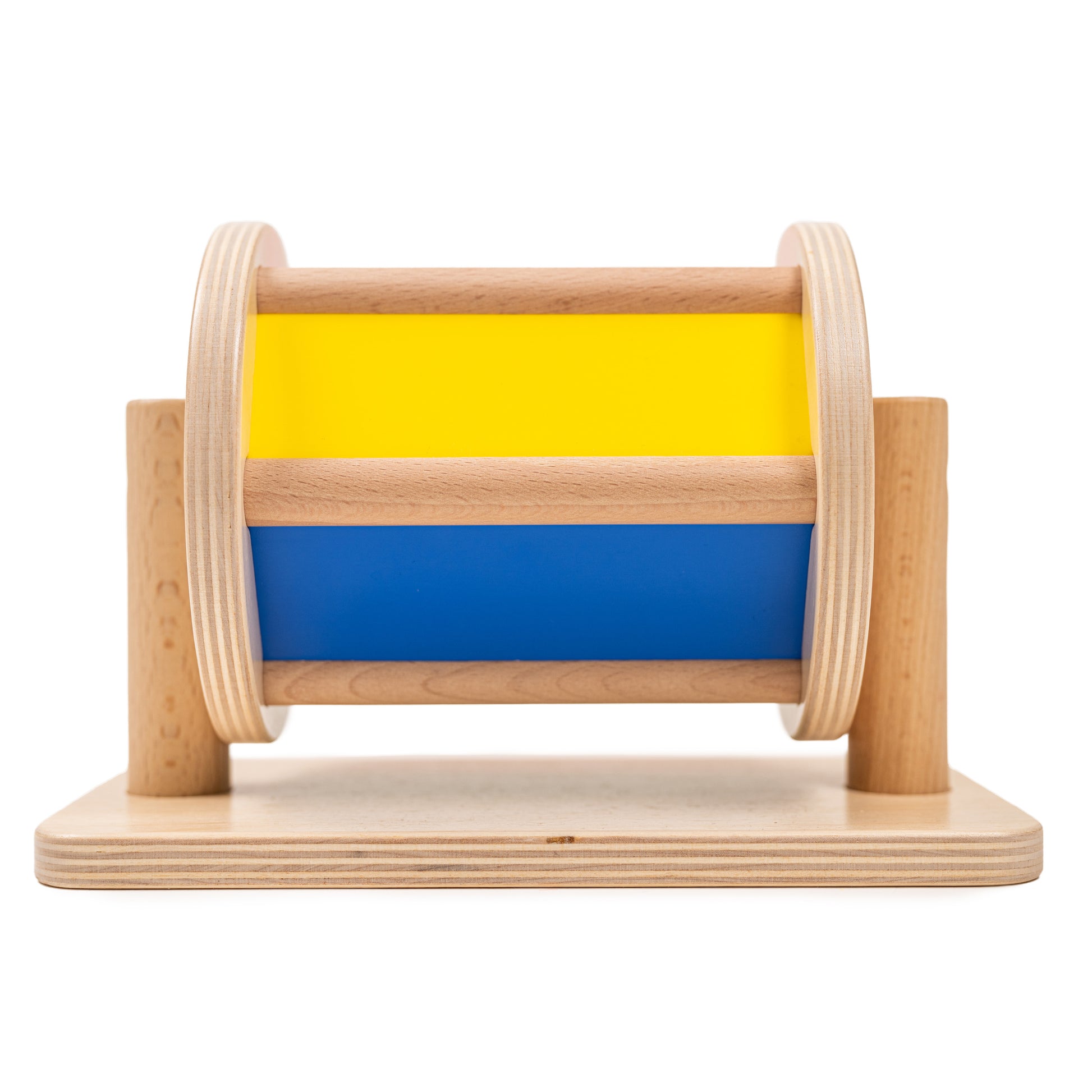 The Spinning Drum is a classic Montessori material for infants aged 6 months and up.