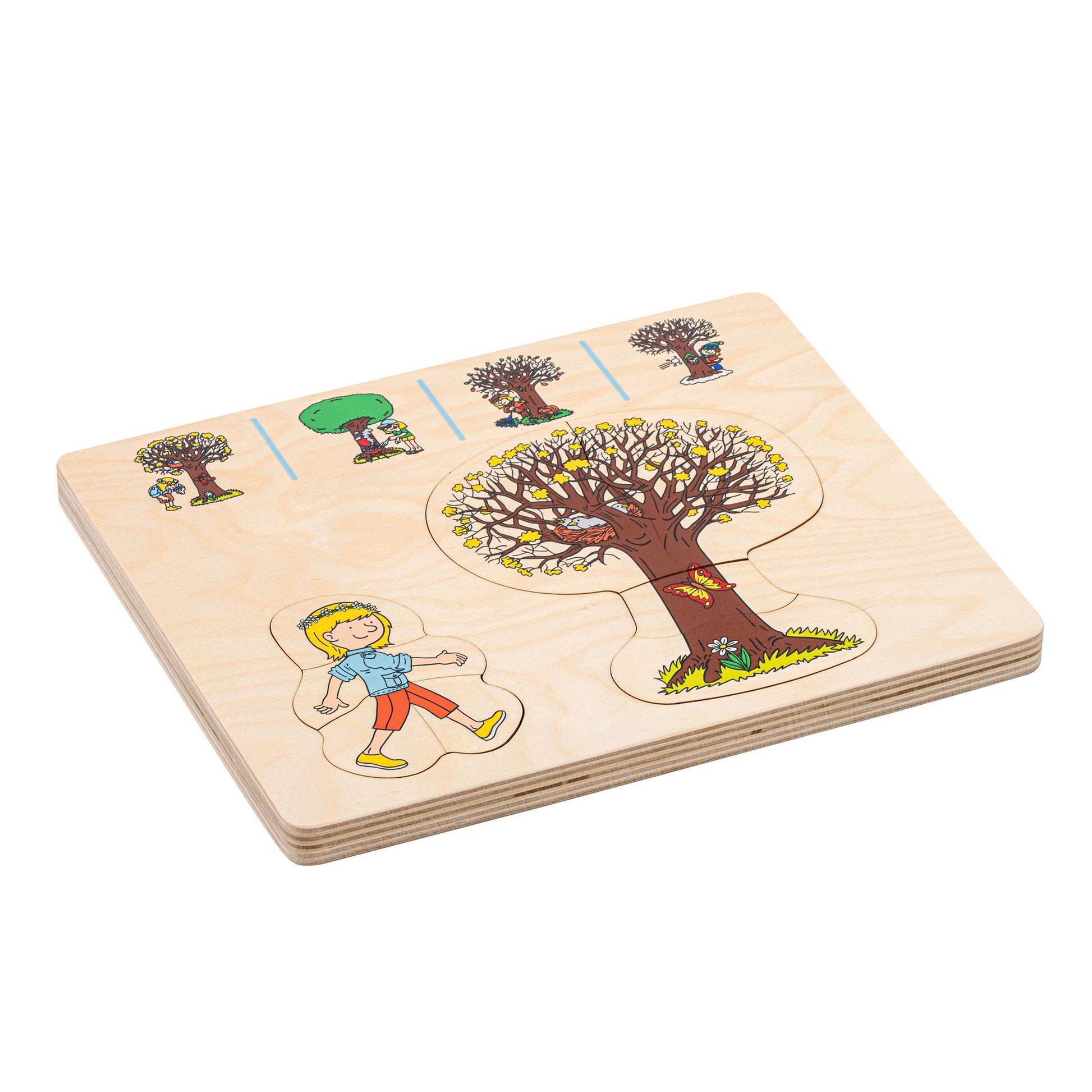 A 4 layered puzzle that shows the 4 seasons: spring, summer, autumn, winter. All layers contain 7 puzzle pieces.