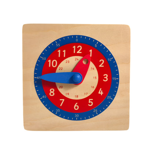 A wooden teaching clock (not a working clock) marked with hours and minutes and the 24 hour clock. The wooden hands have circular holes to view these numbers through.
