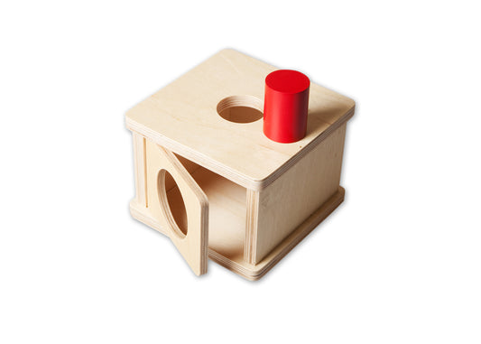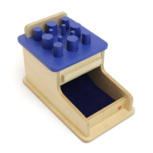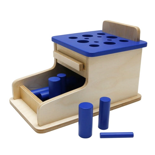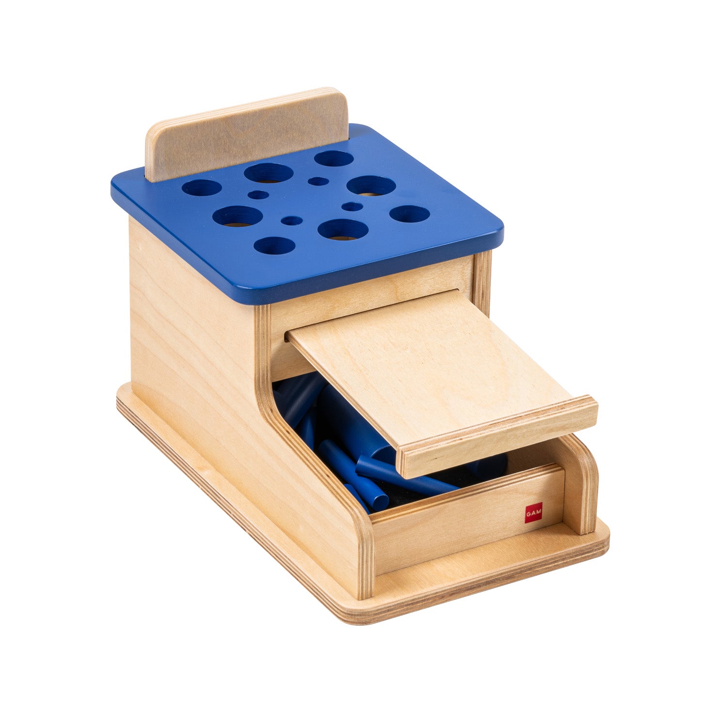 A box to practice eye-hand coordination. The child inserts the cylinders in the round holes and then draws the slider forward to allow the cylinders drop.