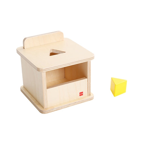 A box to practice eye-hand coordination. The child inserts the prism in the hole and then inserts the hand in the wider opening to take it out.